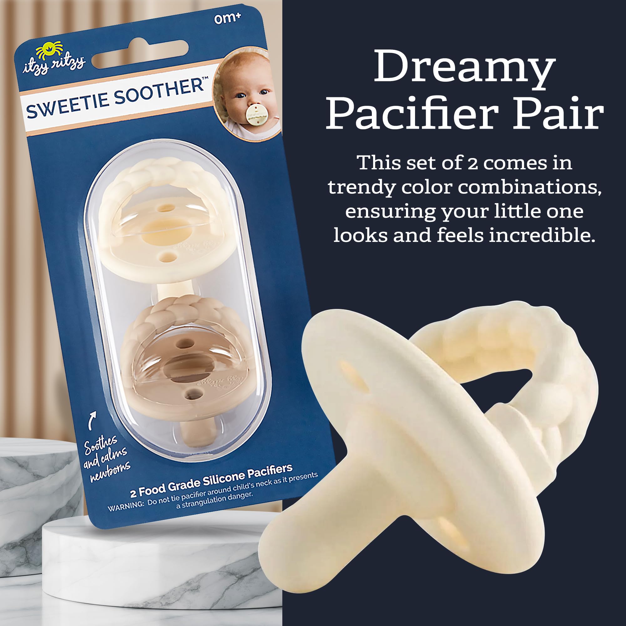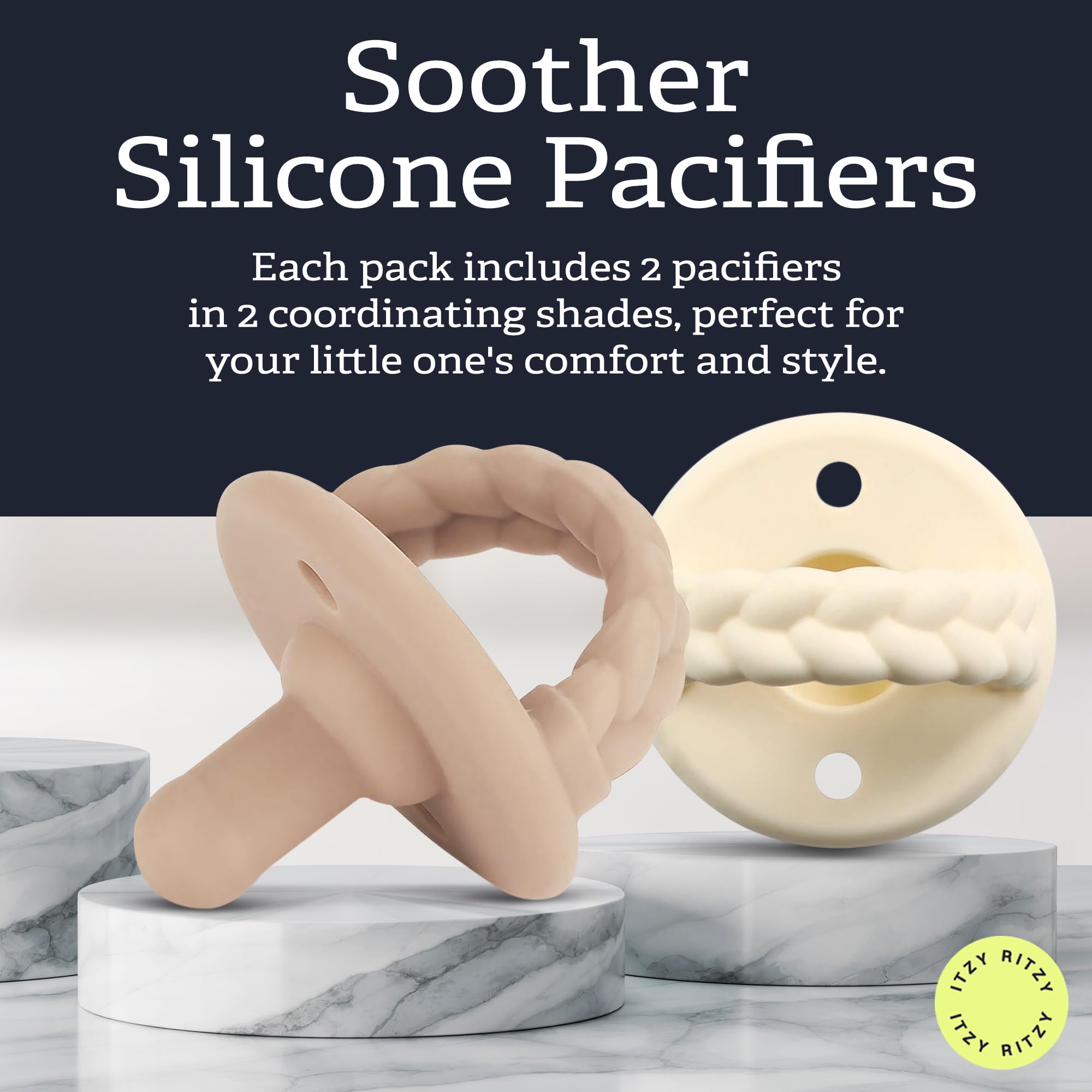 Discover Itzy Ritzy's 100% food grade silicone pacifiers, an excellent choice for your baby's comfort and safety. Crafted with premium silicone and certified to meet strict ASTM standards, this 2-pack of pacifiers features a soft and durable nipple shape ideal for newborns. The adorable braid detail on the collapsible handle adds a touch of style to your baby's outfits, and the two airholes ensure your little one's safety. Make Itzy Ritzy pacifiers a must-have in your newborn essentials, offering both comfort and peace of mind.