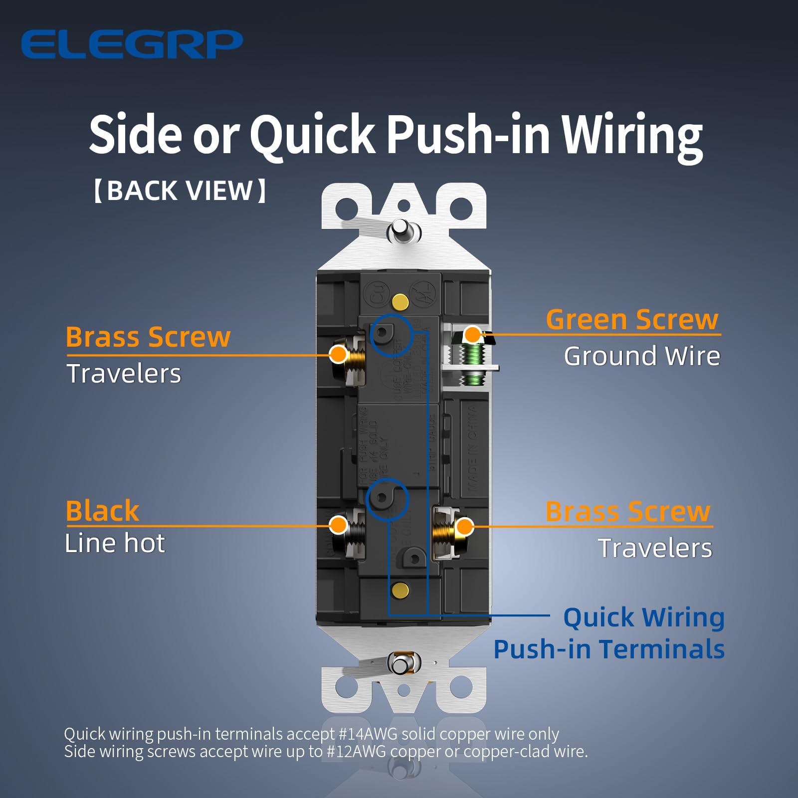 【Easy Installation】Provide both quick push-in wiring and side wiring. Quick wiring push-in terminals accept #14AWG solid copper wire only. Side wiring terminal screws accept wire up to #12AWG copper or copper-clad wire. Break-off plaster ear for best flush alignment. Shallow body design fits standard junction boxes.