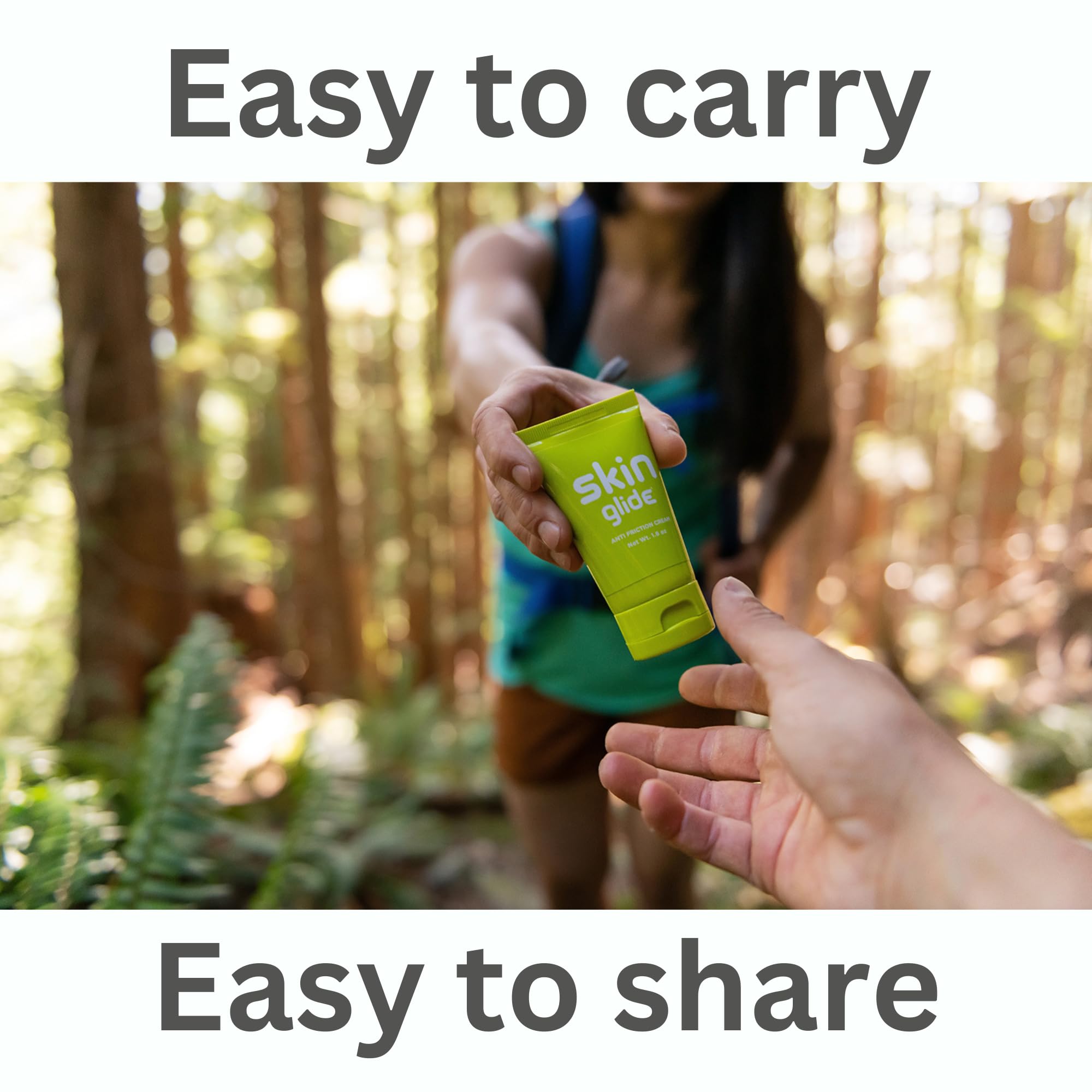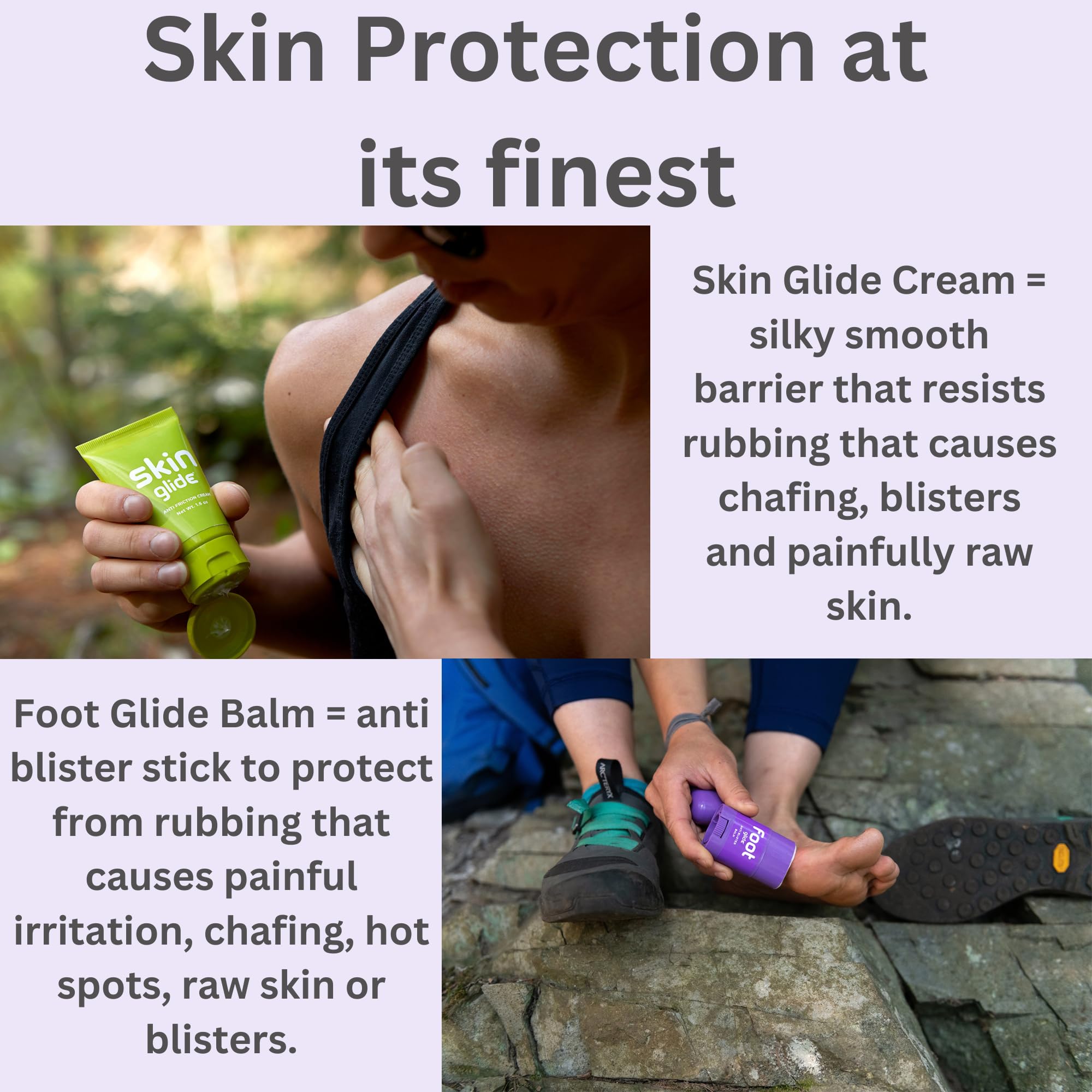 The perfect gift bundle to prevent chafing and blisters in hard, especially in hard to reach places. Skin Glide cream protects hard-to-reach places with a silky smooth and moisture rich anti chafing barrier. Starts out as a cream and finishes as an effective lubricant that reduces the effects of friction, the rubbing that causes rash, irritation, chafing, hot spots under feet, and blisters. It feels like it isn’t even there. Ideal for use every day. It is also great for sharing. Foot Glide balm is infused with Apricot Kernel Oil, Comfrey Leaf Extract, and Vitamins A & C to help soften skin, minimize inflammation and restore dry, chapped, and chafed feet. Both formulas are made with allergen free, plant-derived ingredients that are child safe, vegan approved, and never tested on animals. Water and sweat resistant – keeps pores clog free by allowing sweat to escape and lets skin breath. Never wet or greasy – no petroleum, lanolin, or mineral oils. Give the gift of skin protection and make chafing and blisters a thing of the past.