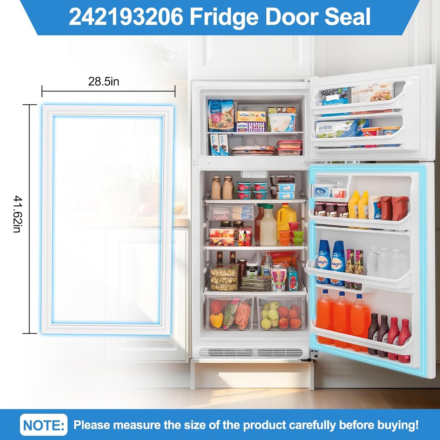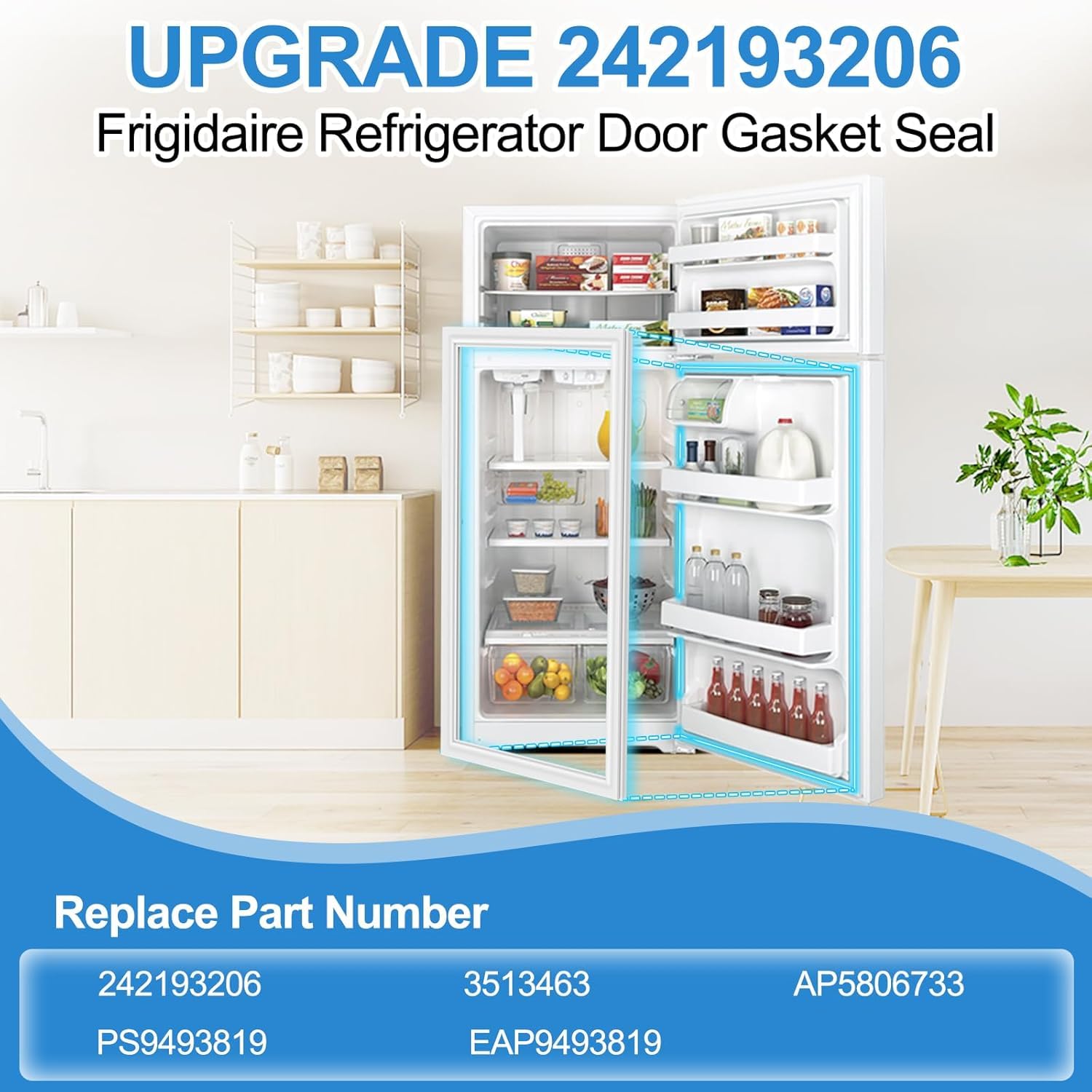 【Part Numbers】This 242193206 refrigerator gasket replacement for Kenmore refrigerator door gasket with precise dimensions(28.5" x 41.6"), replace part number: 242193206, AP5806733, PS9493819, 3513463, EAP9493819. The Frigidaire door seal replacement 242193206 is suitable for Frigidaire/Kenmore refrigerator lower right side door, providing an effective seal around the door to prevent warm air from entering the fridge. High-grade silicone resists cracking even at -22°F/-30°C, lasting 3X longer than standard rubber seals.