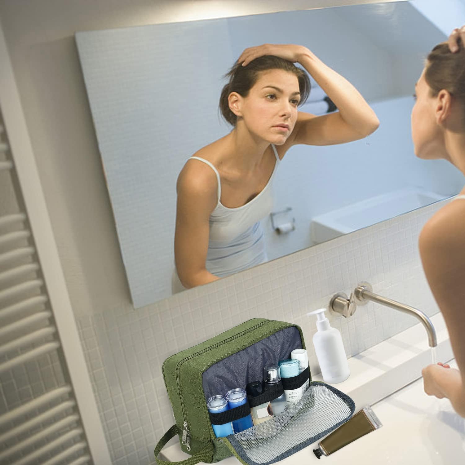 【EASY TO CARRY】 --- The side handle not only makes the travel bags for toiletries easy to carry but also can be used for hanging. Access toiletries easily and quickly!