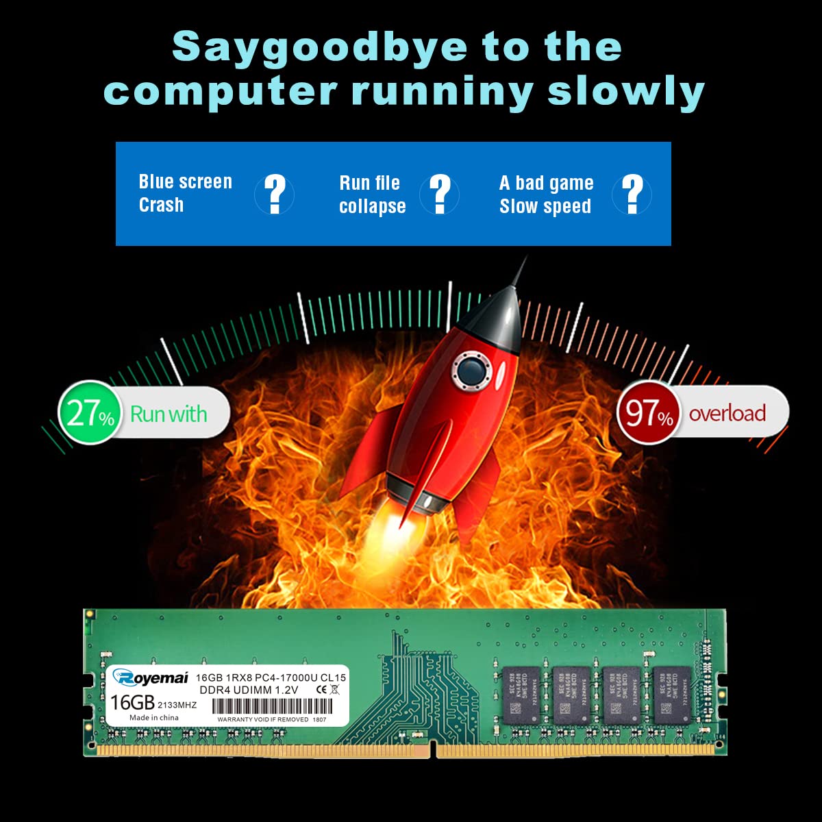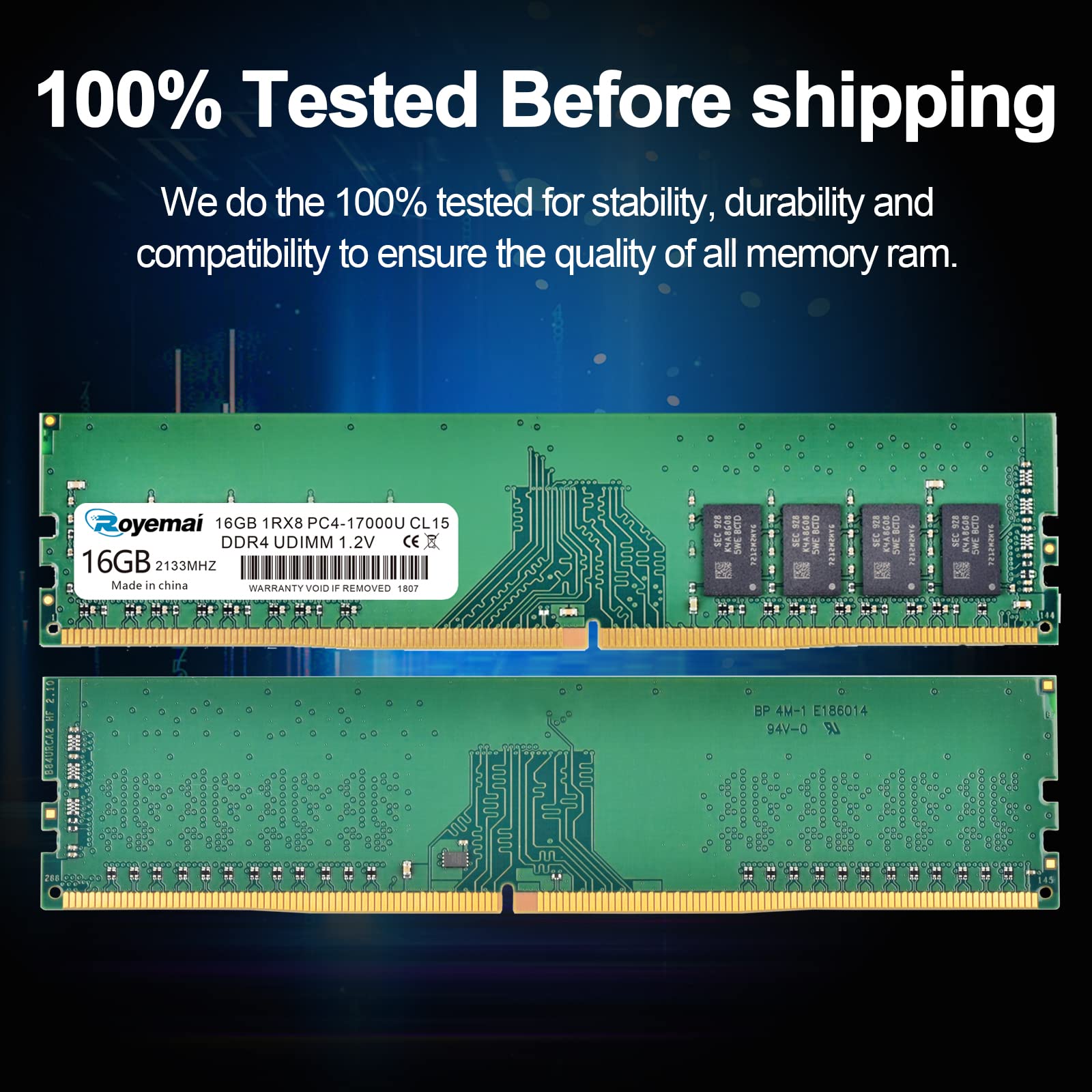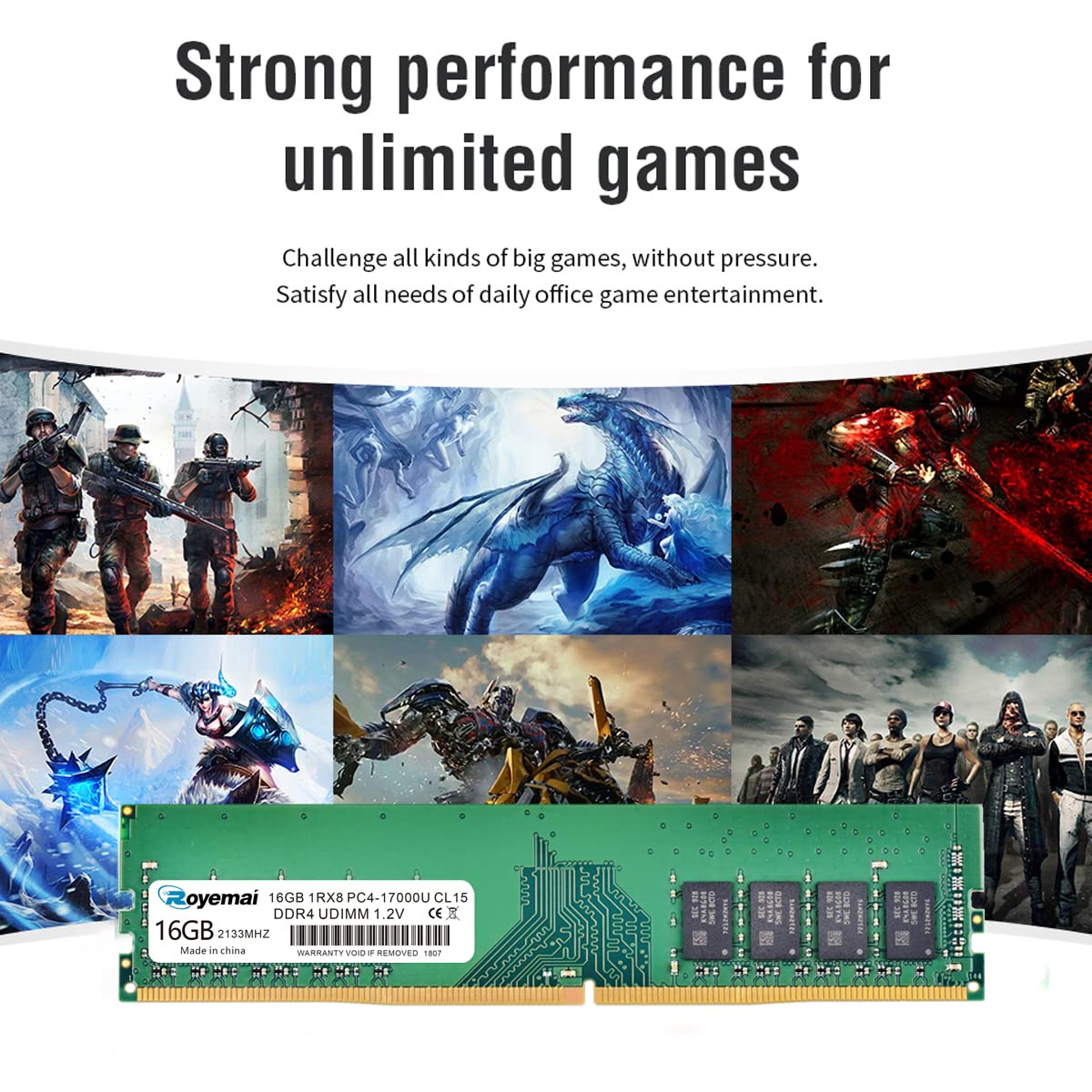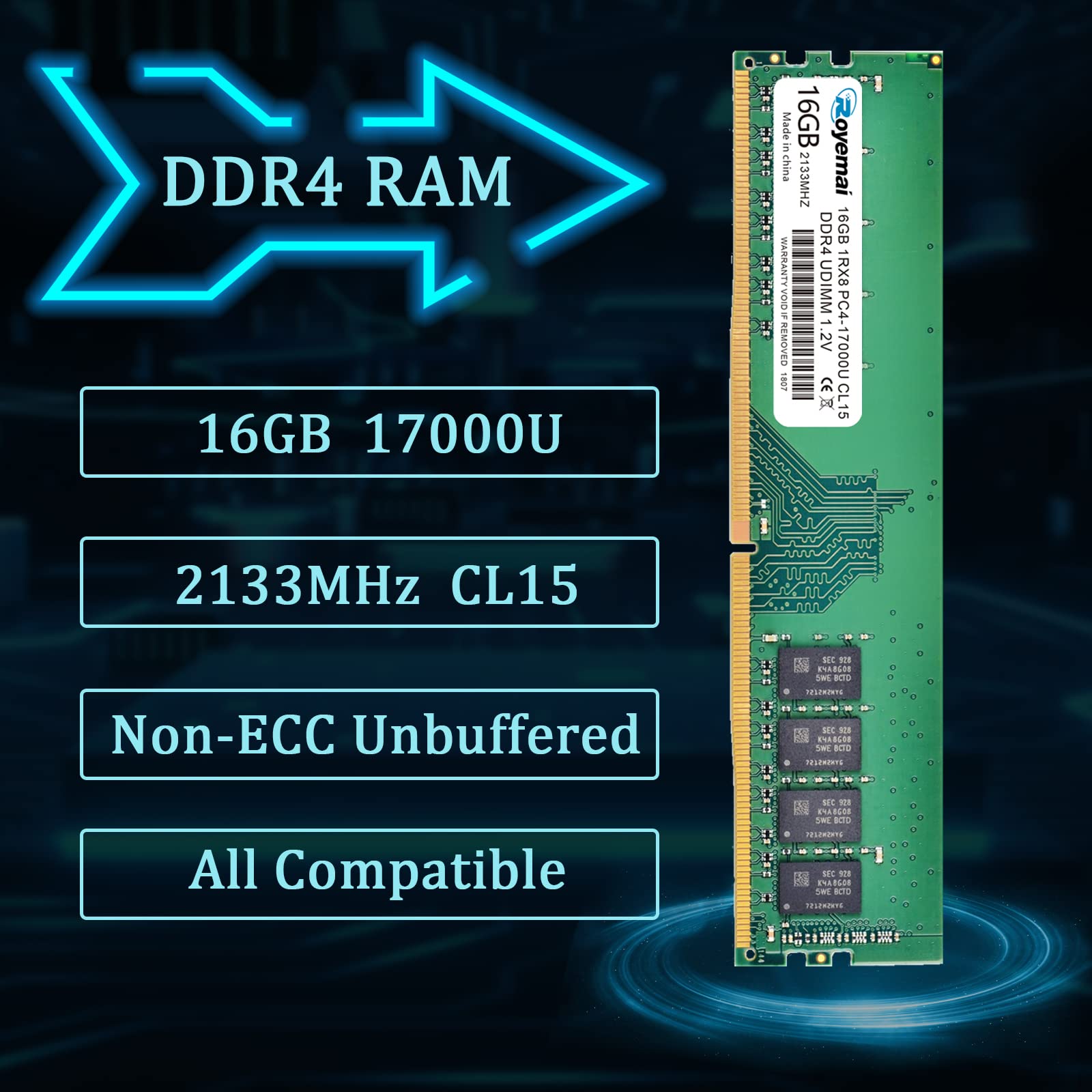 DDR4 17000U PC4 2133 16GB UDIMM, DDR4-2133MHz PC4-17000 CL15 1Rx8 1.2V Non-ECC 288 Pin Desktop Memory Module Ram Please Kindly Note: In case the RAM cannot fit your computer, please ensure the parameters before you purchase, such as the RAM model, RAM slot and maximum memory of your computer. High Stability High-quality originals, strict process. All chips from large brands, through strict testing and screening testing. Advanced electroplating process is applied on the connecting finger will improve corrosion resistance and electrical conductivity. After Long-time burn in test and temperature tolerance test aiming at major system platform, it approves that ROYEMAI memory owns high stability and performance. Faster and Smoother ROYEMAI RAM is designed to help your system run faster and smoother, one of the easiest ways to improve your system's performance. Load programs faster, increase responsiveness, run data-intensive applications easily and increase your desktop's multitasking capabilities. After install larger memory, computer will respond noticeably faster, particularly with lots of windows open. High Compatibility To make sure it’ll be compatible with Intel, AMD System well, ROYEMAI RAM has been through compatibility testing with all popular brands of motherboards. Test results show that memory is able to offer superior performance and high stability required during long time operation for any brand computer. Common Fault Diagnosis 1. Turn on computer, no display ☛ Please try to wipe the connection figure with eraser, don’t use Corrosives, such as ethyl alcohol. 2. Windows often boot into safe mode automatically ☛ Please try to slow the speed of data read in CMOS setting. 3. Computer crash randomly ☛ Please try to slow the speed of data read in CMOS setting. If don’t work, use same frequency RAMS.