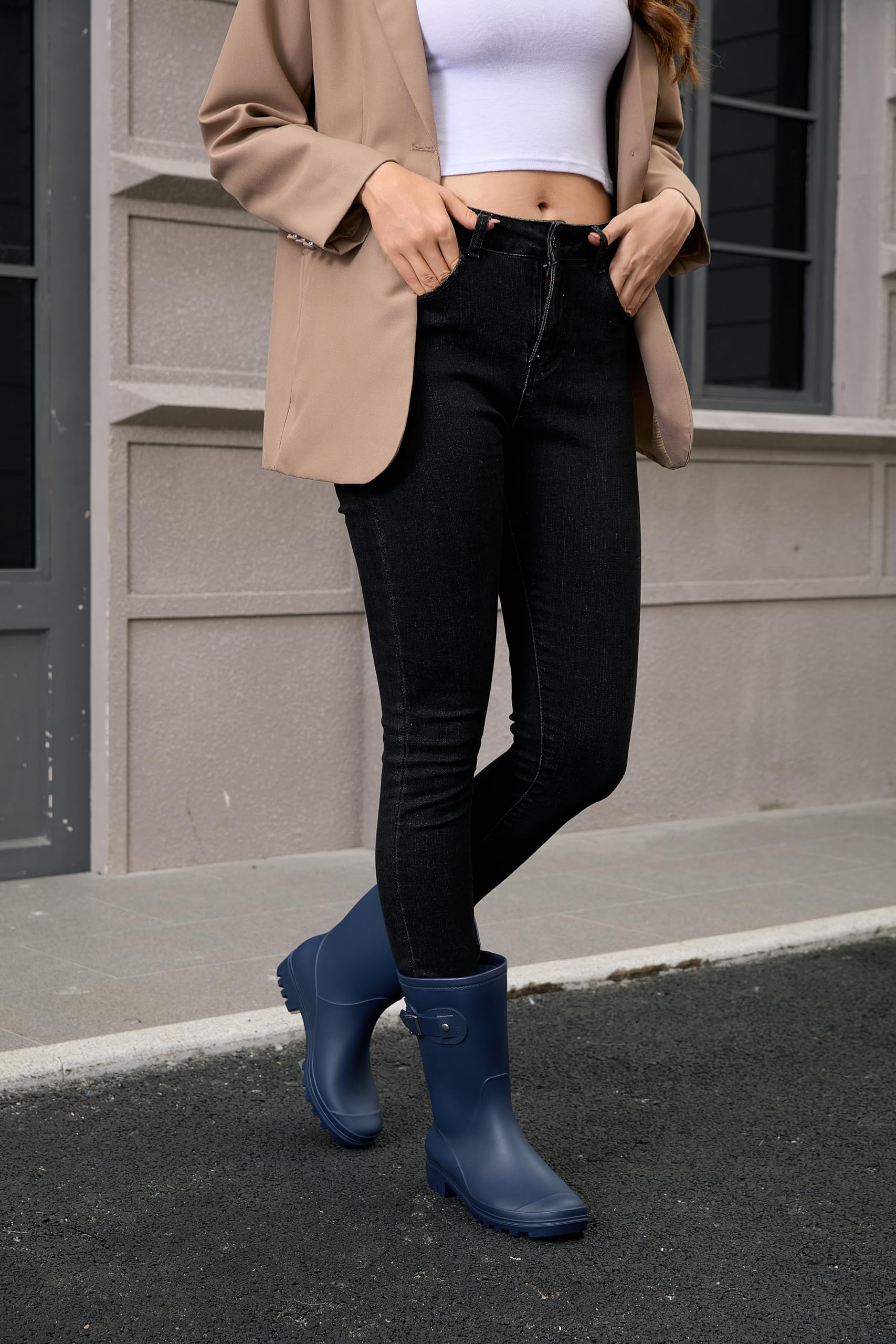 Mid Calf Rain Boot features artificial leather collar at top and decorative buckle on side.