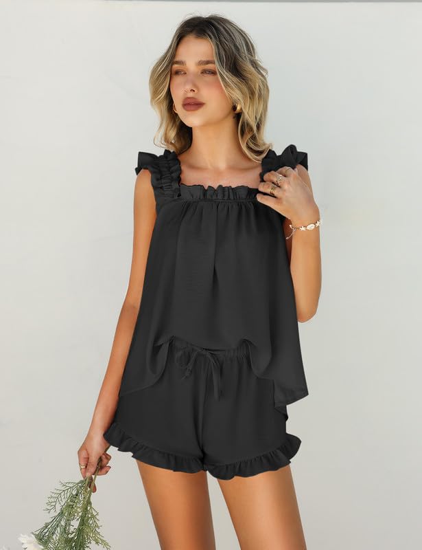 Classy Design: Our Women's pj sets feature a sleeveless top with cascading ruffles, perfectly complemented by cozy elastic drawstring shorts with delicate side ruffle detail (no pockets) for a delightful bedtime ensemble.