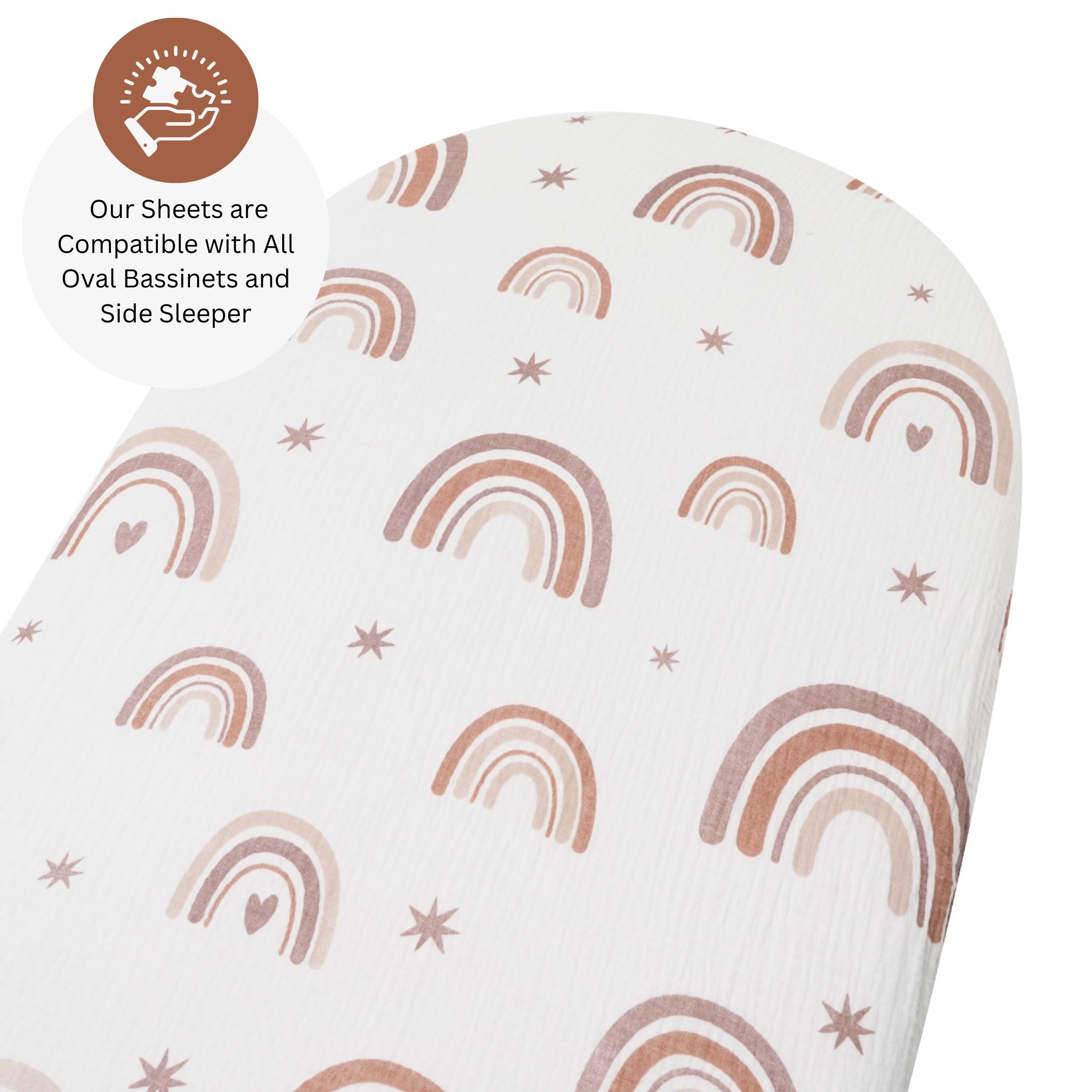 Keep Your Baby Warm, Cozy & Comfy with Tansy Panda Baby Bassinet Sheets! You want your baby to sleep soundly through the night without any interruptions and we want to help make it happen. At Tansy Panda, we use breathable and soft muslin cotton fabric to bring you a fitted bassinet sheet that both baby and parents will love. Tansy Panda portable bassinet fitted sheets keep your baby warm and dry while they sleep and stay firmly in place no matter how much your little one wiggles. Each pack comes with 3 organic bassinet sheets that are easy to clean and maintain. Just the right fit with the adorable rainbow pattern for bassinet bedside sleepers. We use adorable, modern designs that look equally cute on all bassinets for newborn babies including travel bassinet. Unlike the rest, we donβt use any dyes to make sure our newborn bassinet sheets are safe to use and gentle on your babyβs sensitive skin. Our sheets measure in at 30 x 18 inch making these ideal for use with rectangle, bedside, hourglass, and oval mattresses and compatible with Munchkin, 4moms, Happiest Baby, Nordmiex bassinet mattresses. The 360-Degree elastic coupled with the smooth fabric makes sure no lumps get in the way of your babyβs comfort. More Features Youβll Love: - The bassinet cover are machine washable and fade resistant - They donβt lose their softness even after multiple washes - Each pack has 3 sheets so you always have a fresh sheet ready to use - Our universal size with 360-degree elastic band ensures the perfect fit - The sheets are soft and breathable so you can use them around the year - Makes a thoughtful baby registry gift and baby shower gift Maintain Your Babyβs Comfort Around the Clock So They Can Sleep & Dream with Tansy Panda Bassinet Sheet Set!