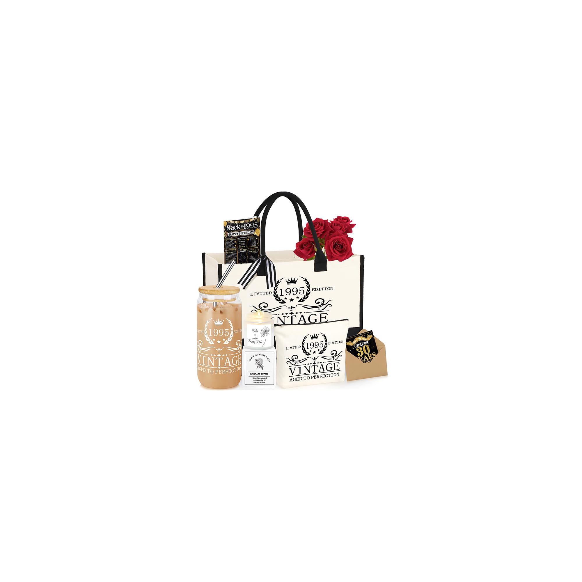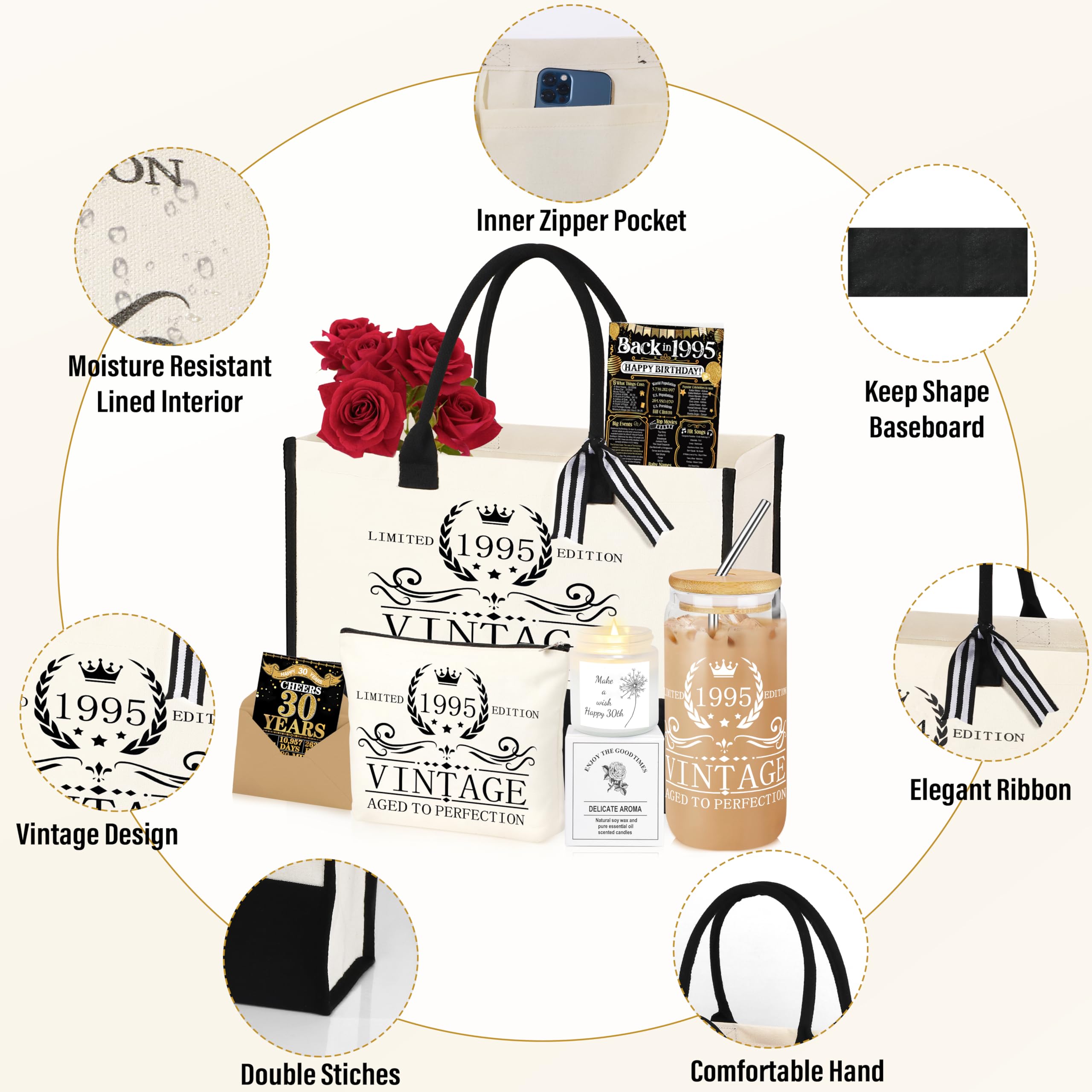 [VINTAGE 1995 BIRTHDAY GIFTS FOR HER]: The unique 1995 vintage tote bag and 1995 cosmetic bag are the perfect gift for a woman's 30th birthday. Designed for a woman born in 1995, the 30th Birthday tote combines practicality and style while also demonstrating care for her unique milestone age. The texture and delicate details of the canvas highlight the high quality and elegant style that perfectly reflects her maturity and confidence