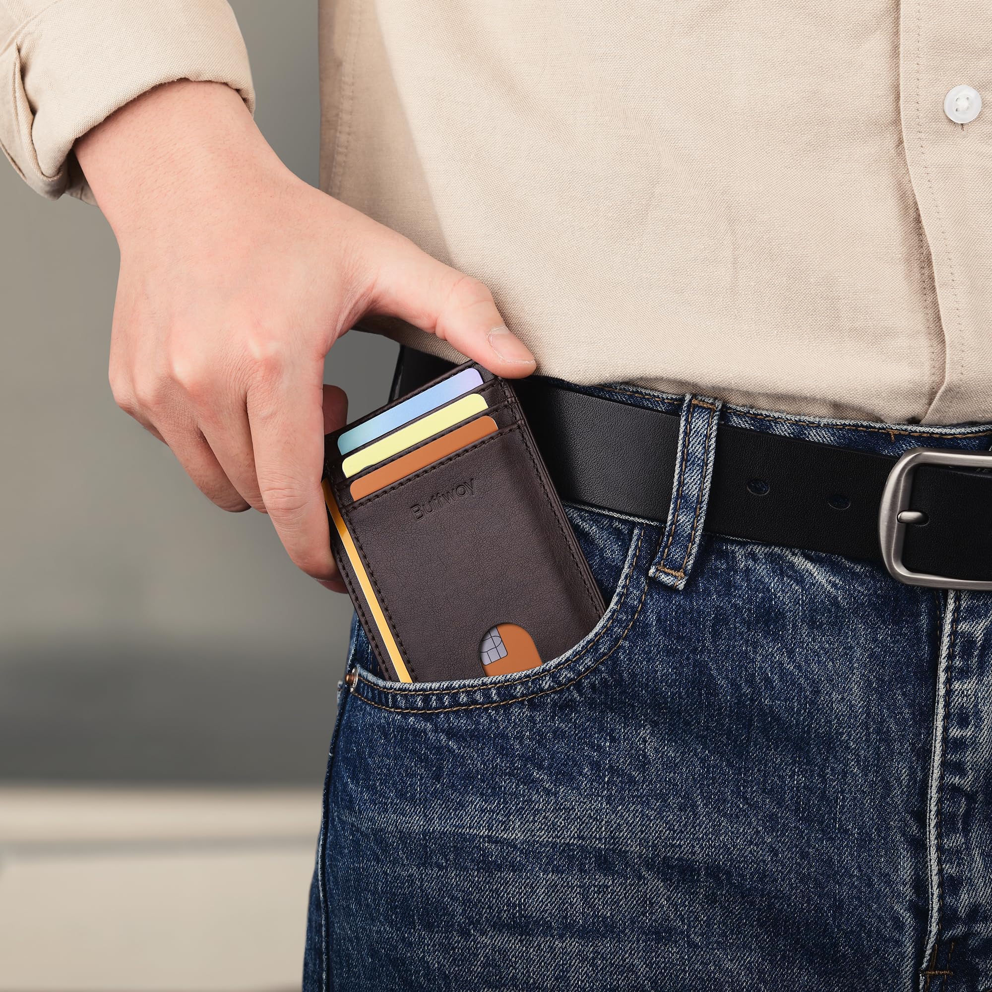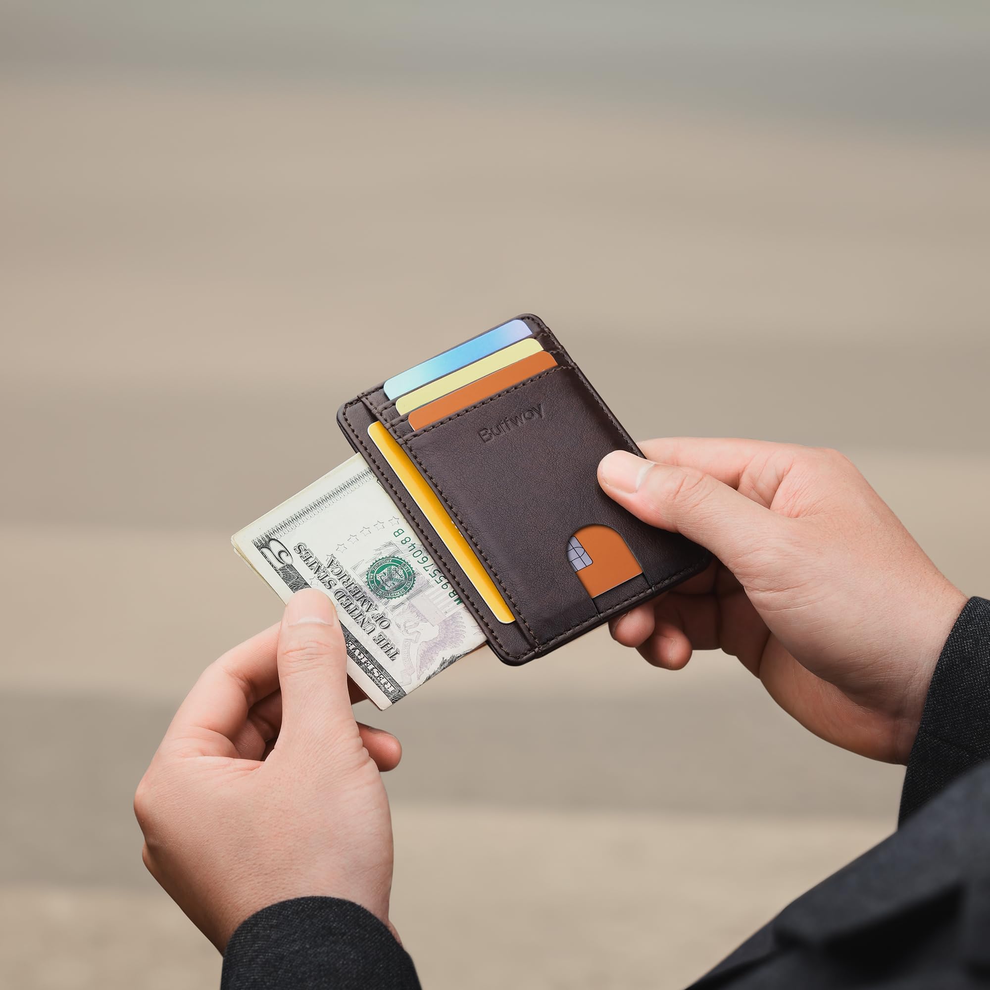 Description Most RFID blocking sleeves are bulky and difficult to carry when traveling, but this one has been designed with the modern traveler in mind. Extra slim, lightweight and perfectly portable. our RFID blocking minimalist wallet is preferred among men and women travelers looking to lighten their load while still protecting their identity, credit cards, passport cards, licenses, etc. The Buffway Wallet Features 8 Slot Compartments - Plenty of Room! - 4 slots for holding credit cards, debit cards, bank cards, passport cards - 1 clear window slot with finger glide for ID, work badge or driver's license - 2 side-slip pockets for business cards, membership cards, train cards, etc - 1 middle pocket for cash bills, tickets, receipts, coupons, notes and so on Minimalist Slim Wallet Specifications: 3 1/8 inch x 4 7/16 inch (1/9 inch thickness without contents) Extremely Thin and Lightweight: 1.05oz About our integrated RFID blocking technology: We want to make sure your identity is safe when out traveling, shopping and getting things done. This is why we've equipped our synthetic leather minimalist wallet with a protective layer that blocks 13-14Mhz electronic signals trying to retrieve your personal information. Thieves use these signaling devices to steal credit card numbers, expiration dates, identifiable details and so much more. Using an RFID blocking wallet like ours is the easiest and most affordable way to ensure your pertinent info is safe and secure. Though it effectively guards against common radio frequencies, our id window minimalist wallet doesn't have the ability to block 125 KHz signals such as those for hotel room keys and access cards.