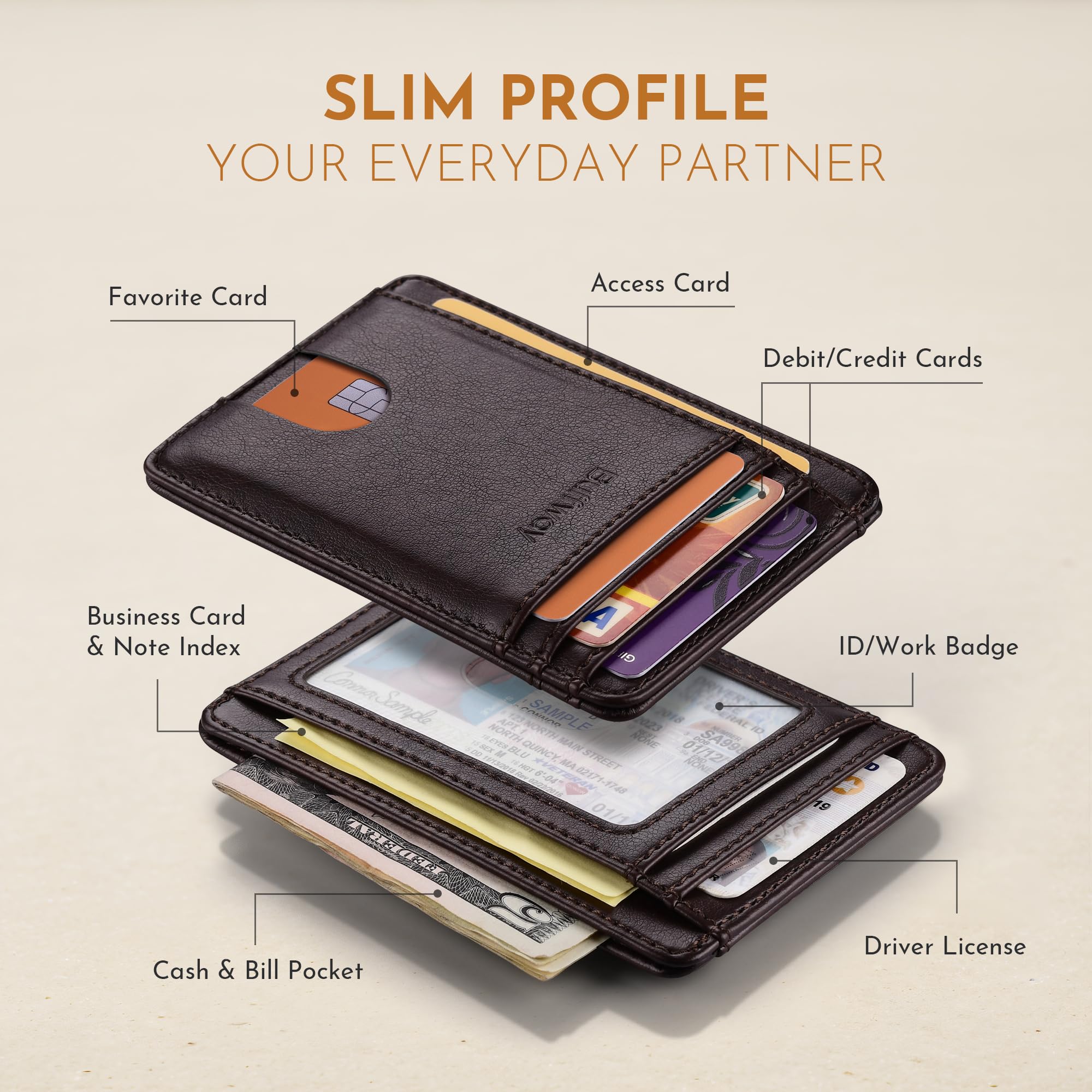 SURPRISINGLY SPACIOUS: Though slim, it features 8 slots to easily organize your essentials. Comfortably holds your driver's license, credit cards, debit cards, and membership cards, keeping everything you need right at your fingertips.