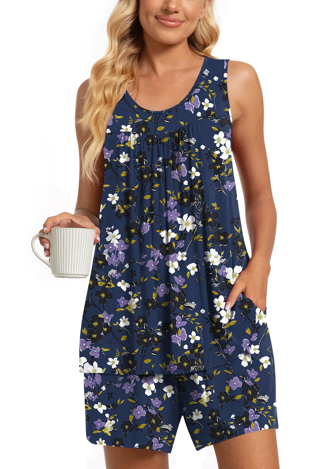 Fashion Simple Design: The ladies pajamas sets sleeveless tank tops with pleated, scoop neck design. Womens pajamas set tops perfect length covers what you need it to like your tummy. The bottoms are very roomy and fit nice with an elastic waistband adapting to different body shapes for all-night comfort. Pajamas bottoms have nice deep hidden pockets to hold cell phone or small things