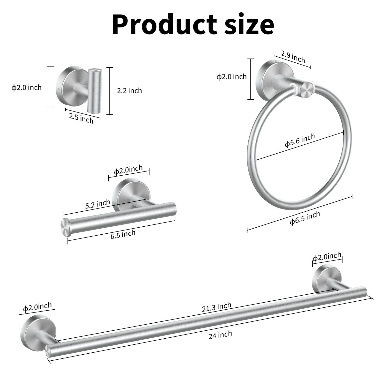 【10-PIECES BATHROOM ACCESSORIES KIT】--Most brushed nickel bathroom accessories on Amazon only contains 16-inch towel bar, our combination includes 24-inch towel holder. 2 Sets of 5 Piece towel bar set ,Includes 24" towel bar, Towel Ring, toilet paper holder and Robe Hook. The same price can get more value bathroom towel rack set and has everything you need for your bathroom.