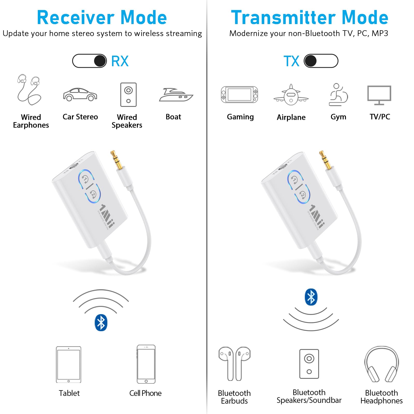 2-in-1 Transmitter and Receiver: 1Mii Bluetooth audio transmitter supports transmitter and receiver mode. In transmitter mode, it is very easy to turn a non-Bluetooth TV, PC, gym/ flight equipment into Bluetooth transmitter. In receiver mode, Bluetooth 5.3 chip ensures high fidelity Bluetooth audio signal for music streaming to those speakers or car/ home stereo systems that doesn’t have the Bluetooth capability.