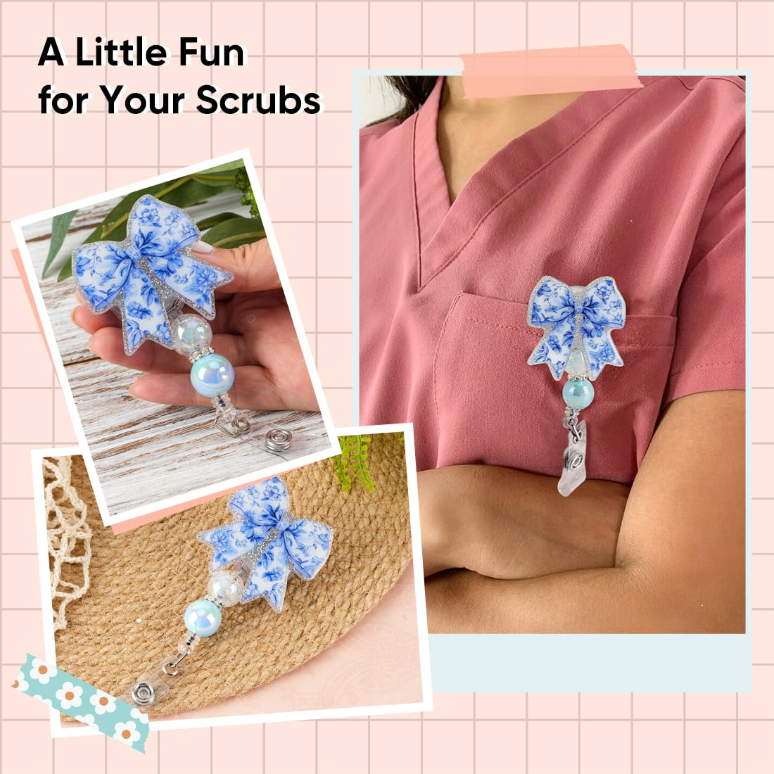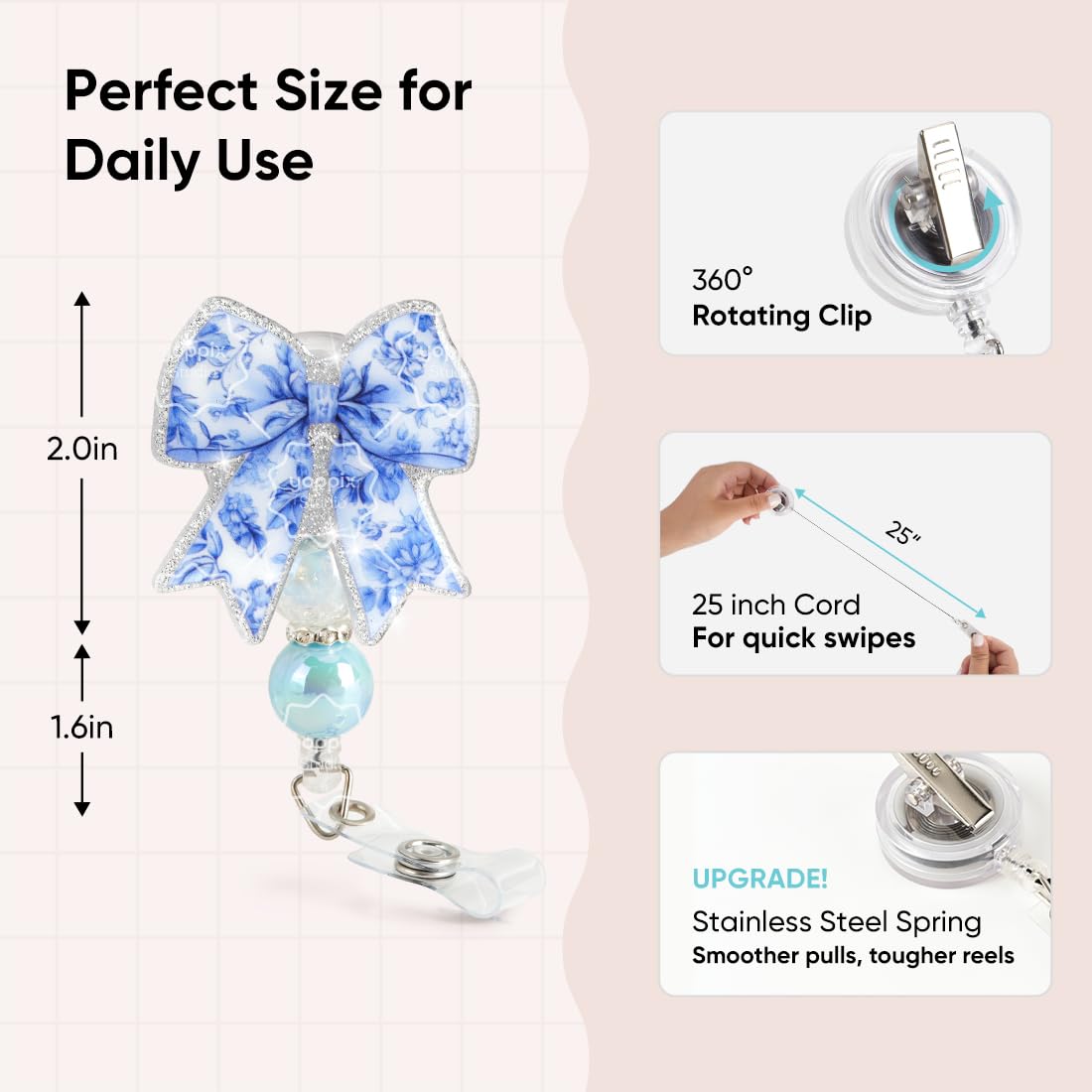 This blue floral bow badge reels make an excellent gift or add personality of your own to your scrubs or uniform. They make super fun and useful gifts for any person in any profession. A great gift choice for nurses, teachers, students, medical staff, office staff, and anyone who is required to wear an identification badge