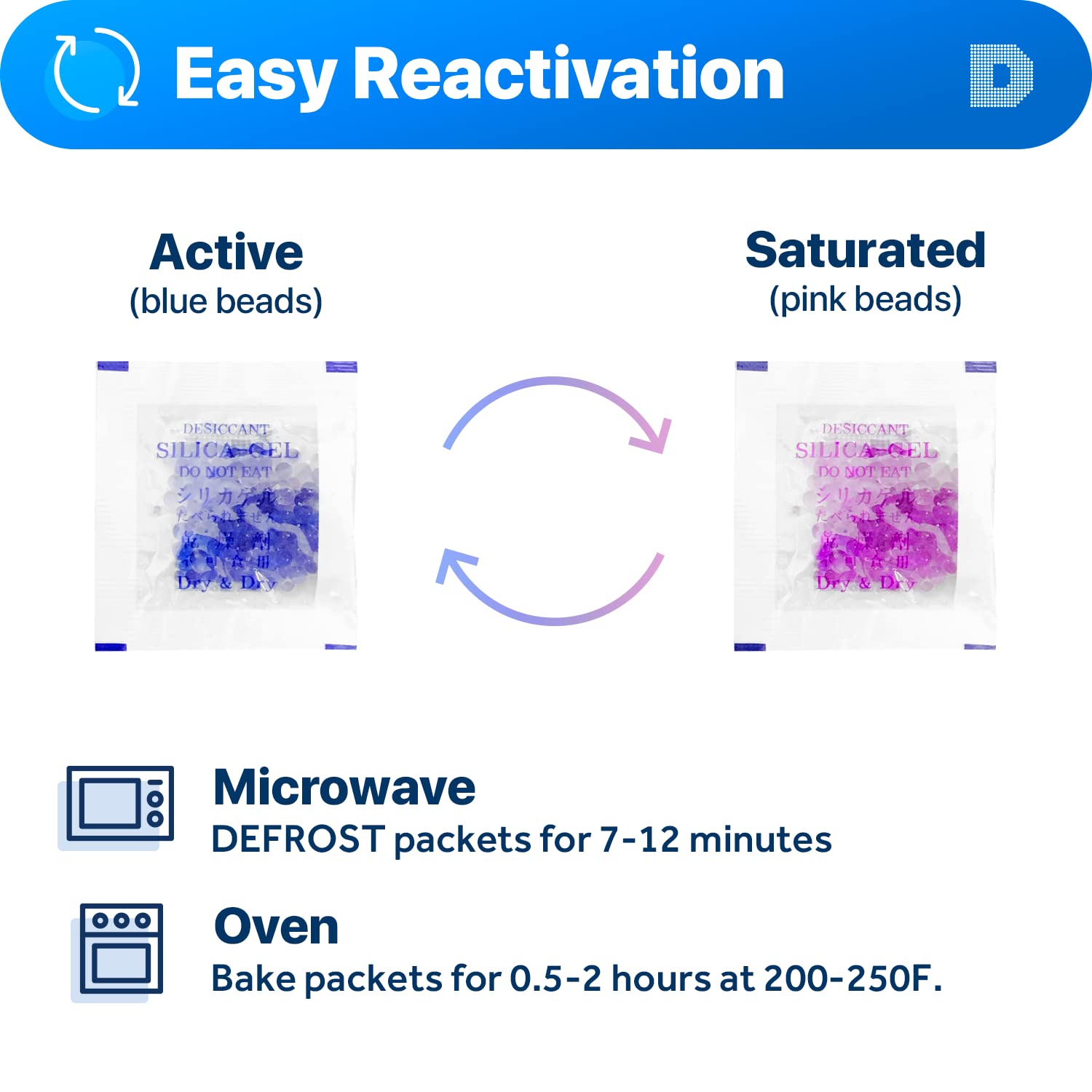 [Ultimate Moisture Absorption and Reactivation] Clear plastic packets with tiny holes to allow moisture to pass through; if you would like the packets to work faster, you can poke a few more holes with a pin needle; For Reactivation, bake in the Oven for 0.5 to 2.0 hours at 200 to 250F or Microwave for 7-12 Minutes at Defrost Mode