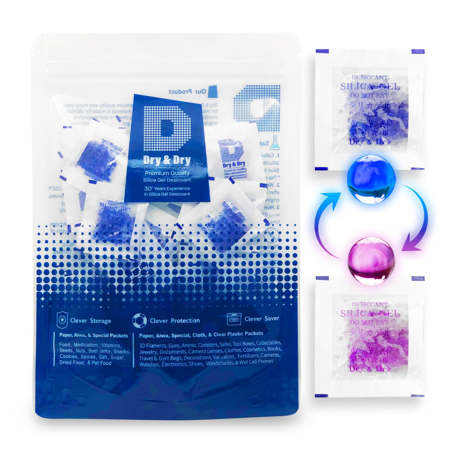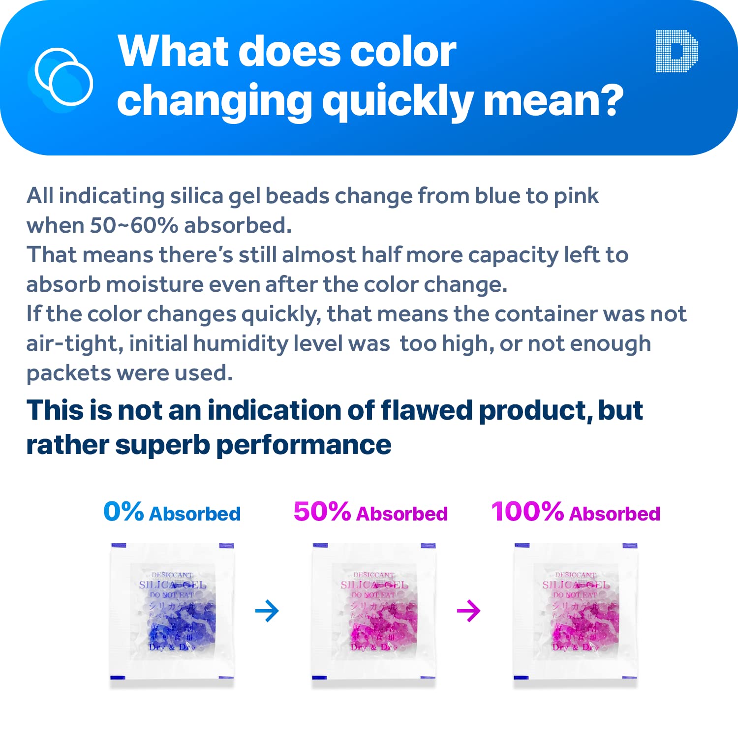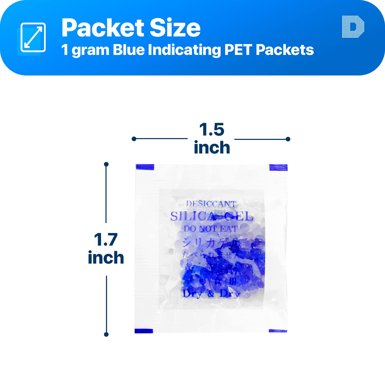 [Packet Specification] (Packet dimension: 1.5 inch x 1.7 inch); 1 gram desiccant packets can cover approximately 120 cubic inch volume containers; We recommend placing more packets than recommended for extra protection; [Easy to Read Indicating Packets] Blue beads will change to Pink when saturated with moisture; Blue means Dry and ready to use; Pink means Saturated and needs to be replaced or reactivated;