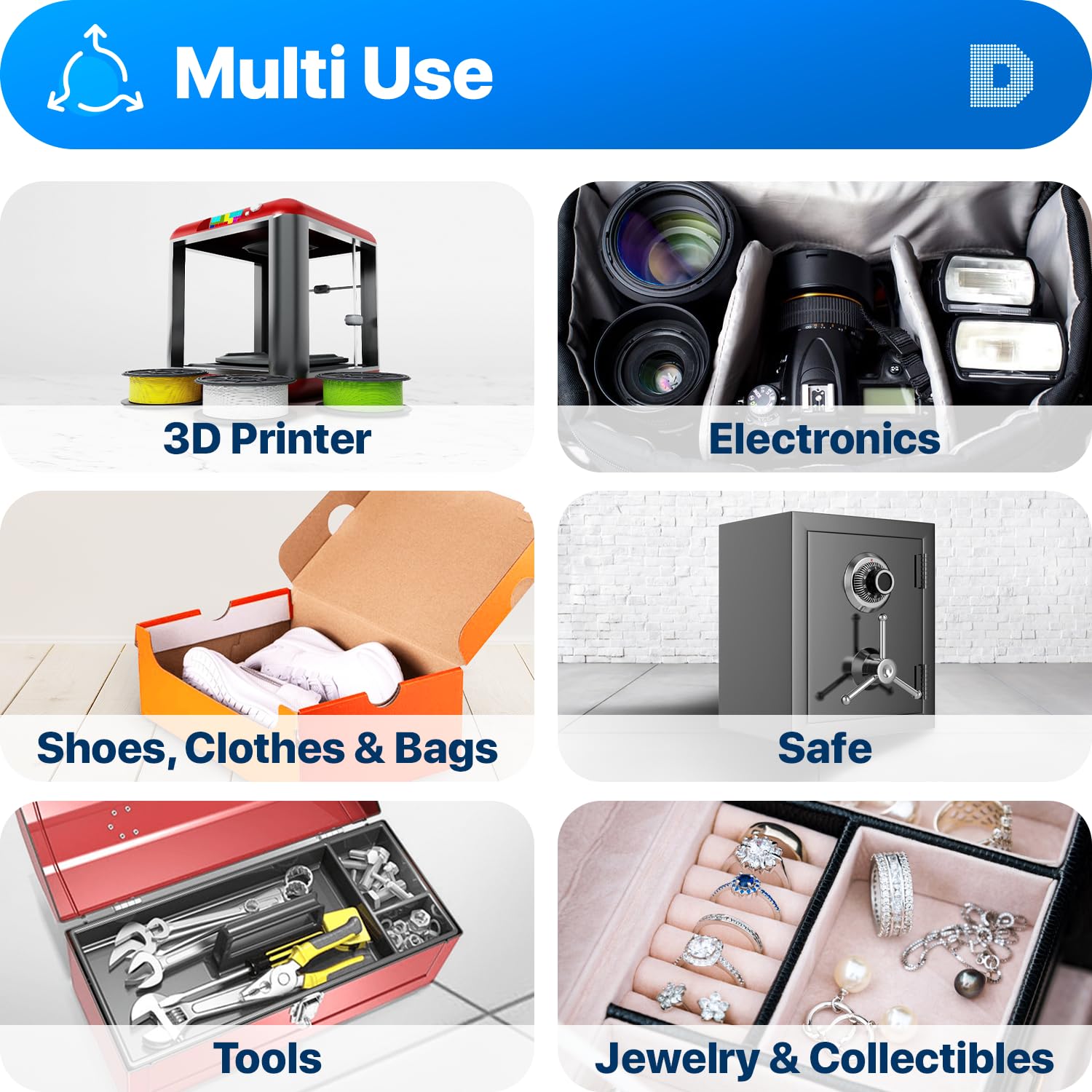 [How To Use] Place your items and silica gel packets in a tightly sealed container to protect your items from moisture damage; Use silica gel packs to protect 3D Filaments, Safes, Guns, Ammos, Canister, Collectables, Jewelry, Documents, Camera Lens, Clothes, Cosmetics, Books, Bags, Decorations, Wet phones, Cameras, Watches, Electronics, Shoes, and Many Other Valuables; Do Not Use for Food or Medication