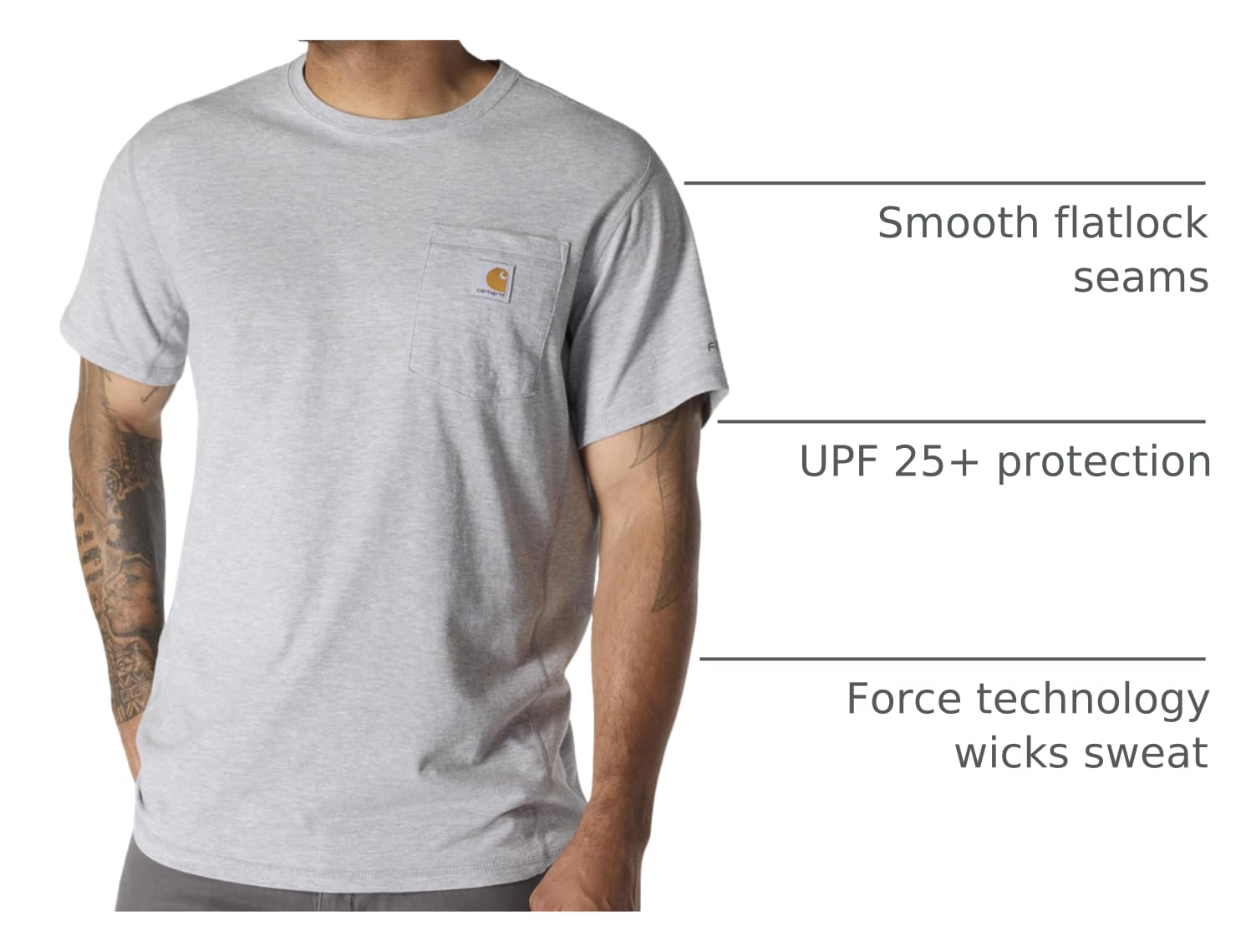 Description On the job or under the sun, this men's Carhartt t-shirt keeps you cool and comfortable. UPF-rated jersey fights off sweat and dries fast so you can stay focused on the task at hand. Ventilated panels keep the air circulating, and a drop-tail hem provides extra coverage.