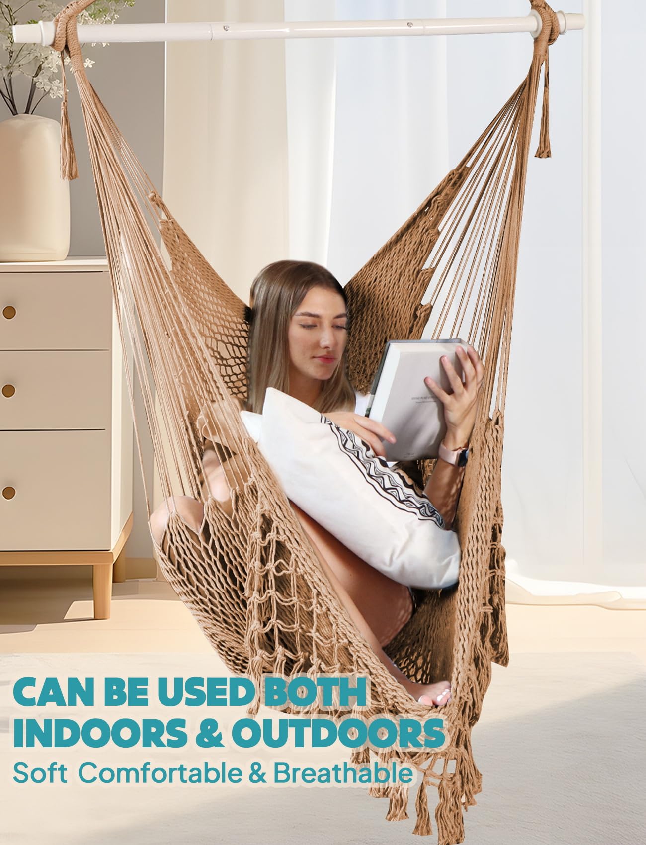 Comfort and Health benefits: They offer a gentle swaying motion that can be very soothing.Hammock chairs are incredibly comfortable and provide a unique sitting experience that can offer several health benefits, including improved circulation, reduced muscle tension, and better sleep quality.Strong metal spreader bar promotes your long lasting enjoyment.