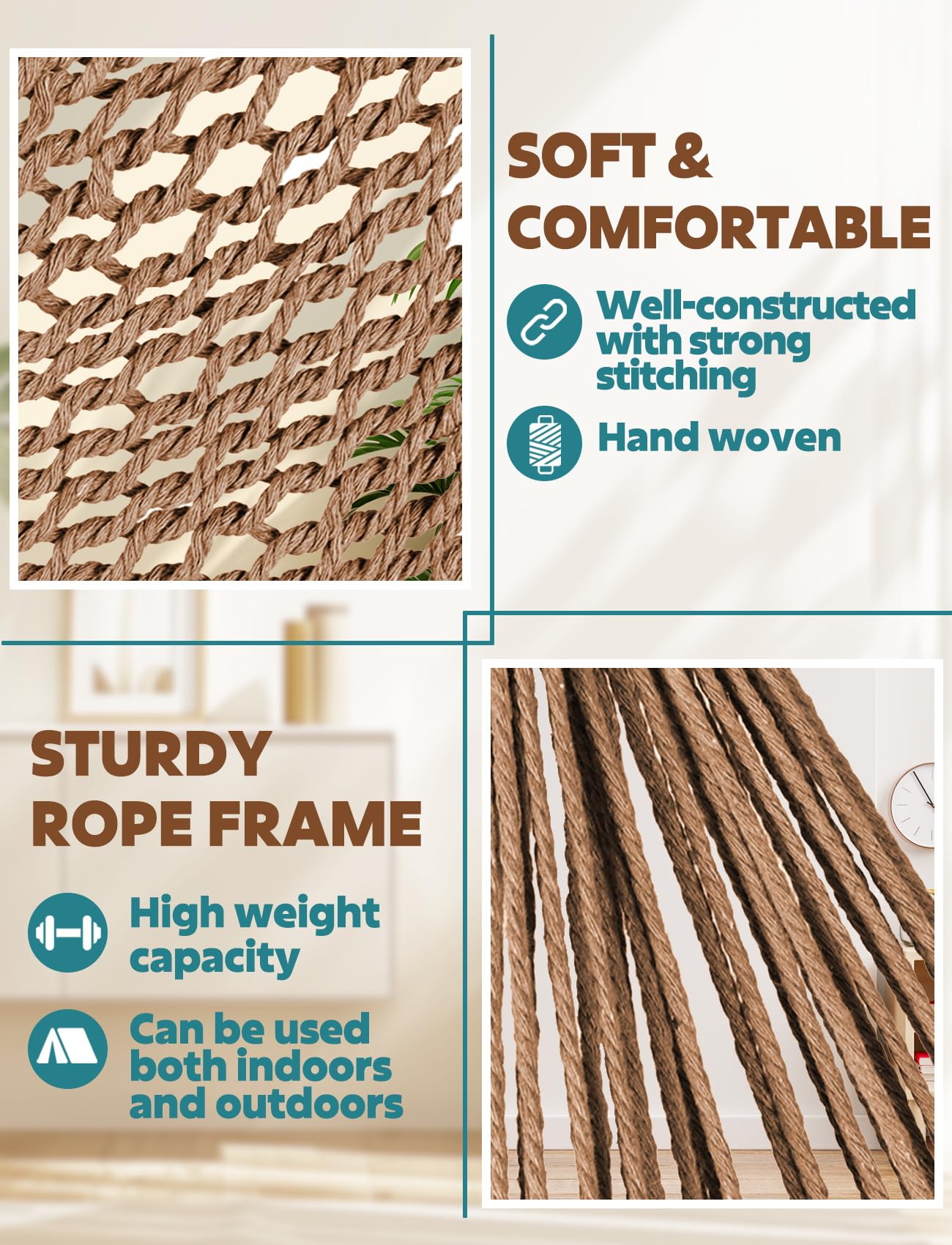 Design:Handcrafted from comfy and durable cotton ropes of the entire chair promise enjoyment and that is well-constructed with strong stitching and a sturdy frame to ensure safety and comfort.100 cm(3 1/3 ft) length wide spreader bar provides ample shoulder room.Extra long built in footrest to really stretch out .The mesh lets the cool breeze blow your body, breathable and cool.Anti-slip poles provide a stable and secure seating experience, preventing from slipping or sliding off the chair.