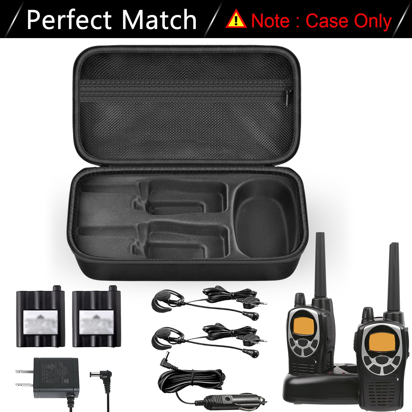 Tailor-made walkie talkie radio case for : Two way radio storage holder perfectly fits for gxt1000/ 1030/ 1050VP4 50 channel GMRS two-way radio(pair pack) and a base, the fine long range walkie talkies hard case protects gmrs radio and can also hold a variety of accessories, convenient for home storage or outdoor carry. External dimensions: 12.44*6.69*3.38in. (For sale is box only, not including for walkie talkies radios.)