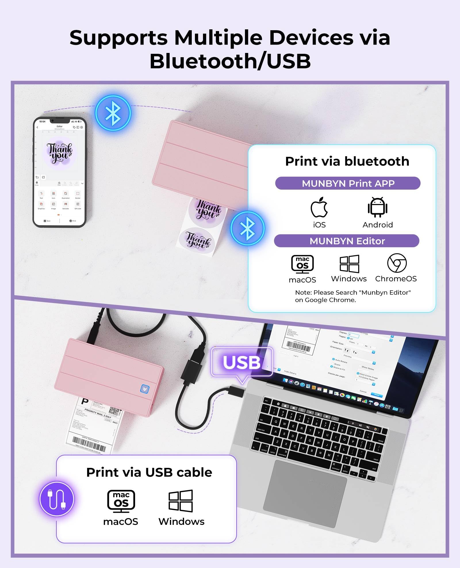 Effortless 3-Step Setup: Connect, Design, Print Get started in minutes. For iOS/Android, simply download the 'MUNBYN Print' app and connect via Bluetooth. For PC or Mac, just open Google Chrome, search for the "Munbyn Editor" web app, and start designingβno software installation needed. For Bluetooth-less desktops, a simple USB connection works too. It's seamlessly compatible with major platforms like FedEx, UPS, USPS, Amazon, and Shopify, making every printing task a breeze.