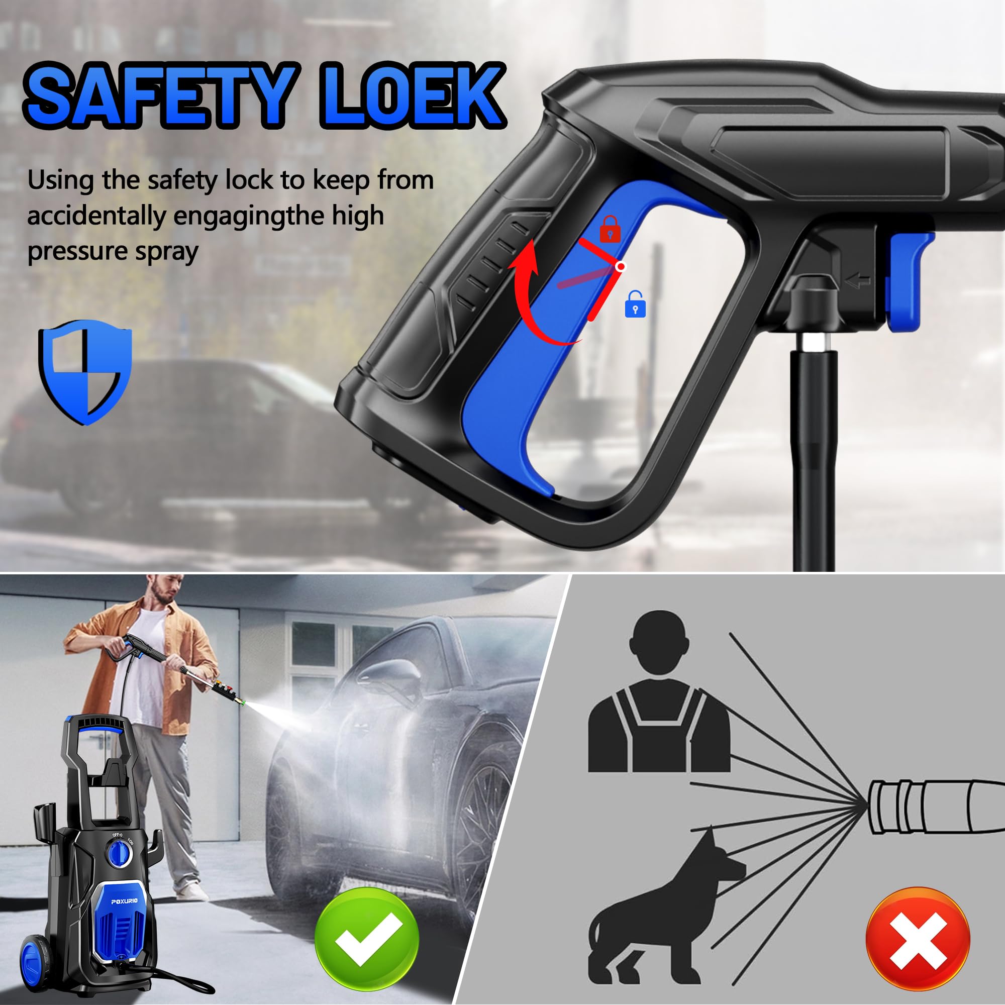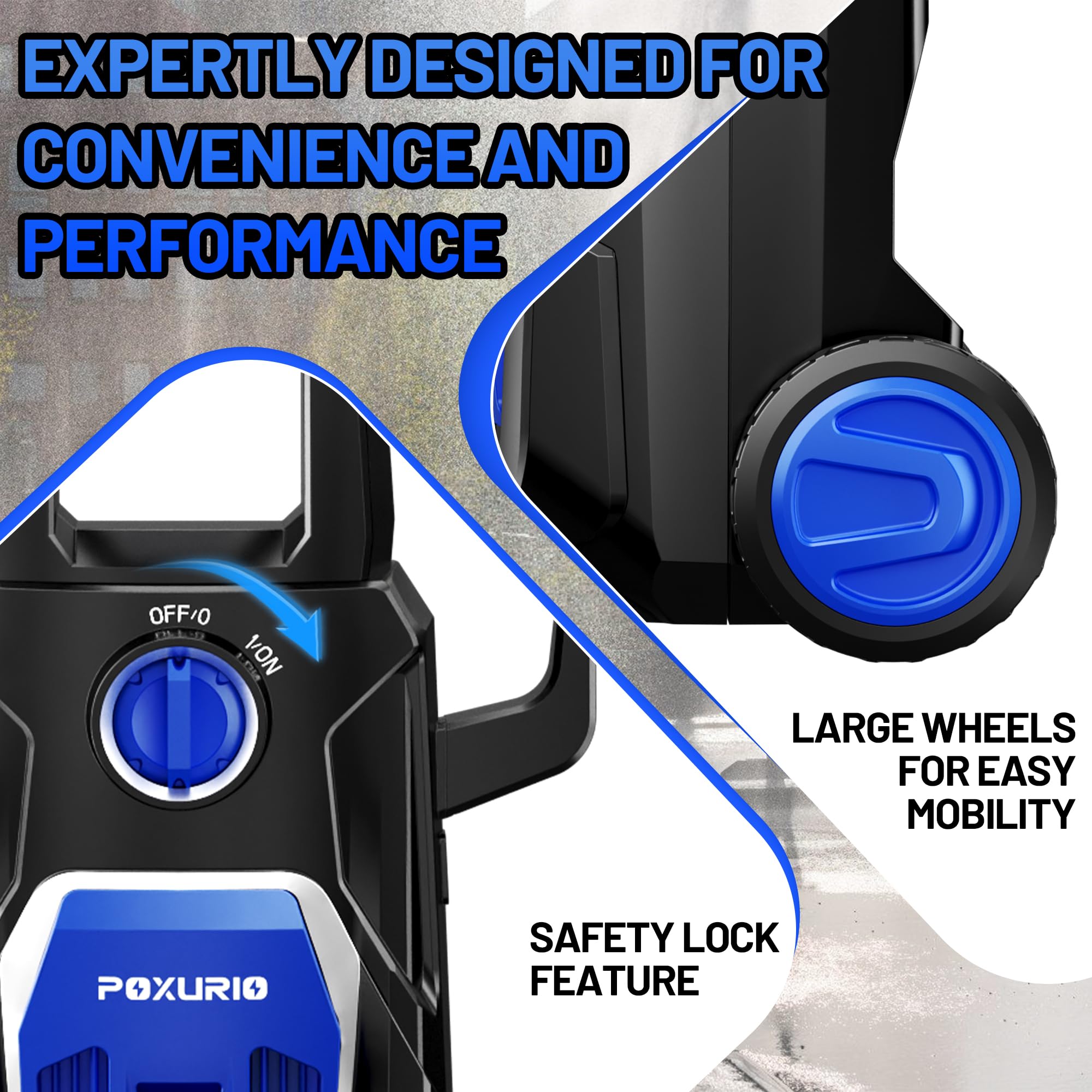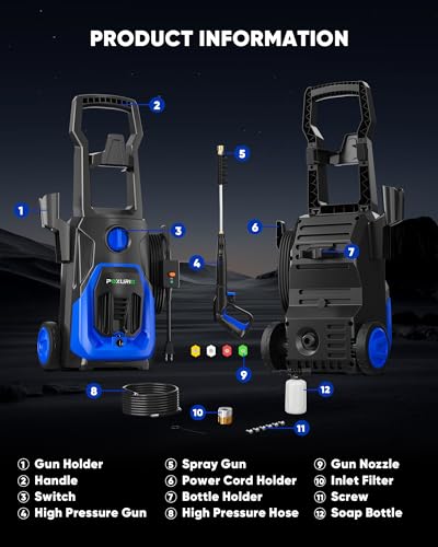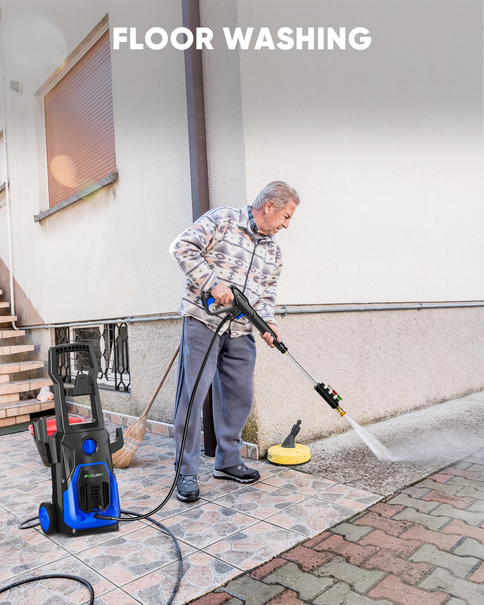 【Powerful Cleaning Performance】The POXURIO electric pressure washer is equipped with an upgraded 1800W motor, delivering a maximum water pressure of a flow rate of 2.8 GPM. Whether cleaning large surfaces or tackling stubborn stains, it provides exceptional cleaning performance and is the ideal tool for all your cleaning tasks.