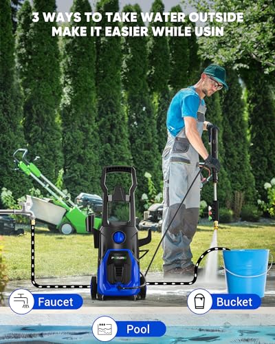 【Self Priming Function】With 3-in-1 water taking methods, this electric power washer machine is easy to use and can be assembled in minutes. Also designed with large wheels and the convenient handle, you can move around easily.