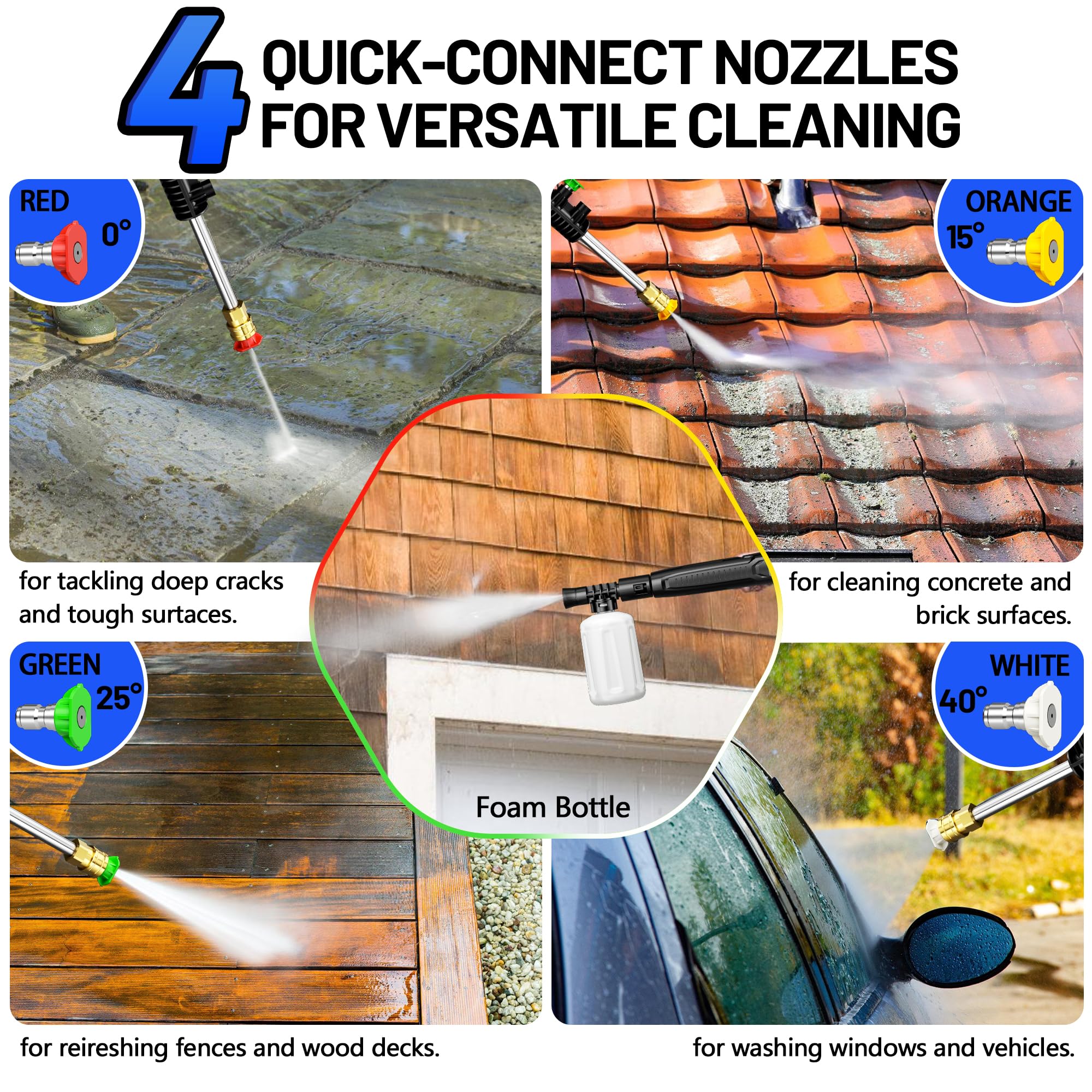 【Diverse Accessory Options】The POXURIO electric pressure washer comes with four different quick-connect nozzles and a 450ml foam cannon, providing versatility for various cleaning needs. Whether washing cars, patios, or exterior walls, it handles every cleaning task efficiently with ease.