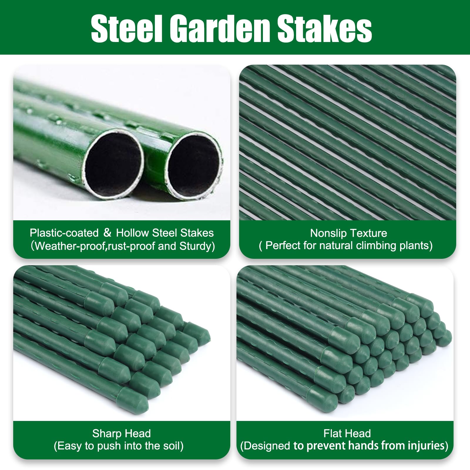Sturdy and Durable:Tomato stakes are plastic coated steel stakes, which inside are hollow but very sturdy and durable. Our tomato plant support last longer compared to bamboo stakes and wood stakes.
