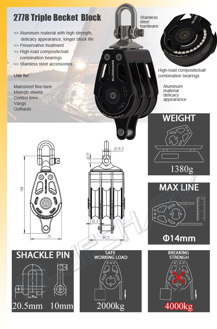 BLUESHARK Premium 75mm High Performance Aluminum Sailing Blocks Made of 6061T6 aluminum alloy with anodized hard coating which is twice as thick as black anodizing to provide double protection and corrosion resistance to air and salt water. Delrin balls and marine grade 316 stainless steel hardware.