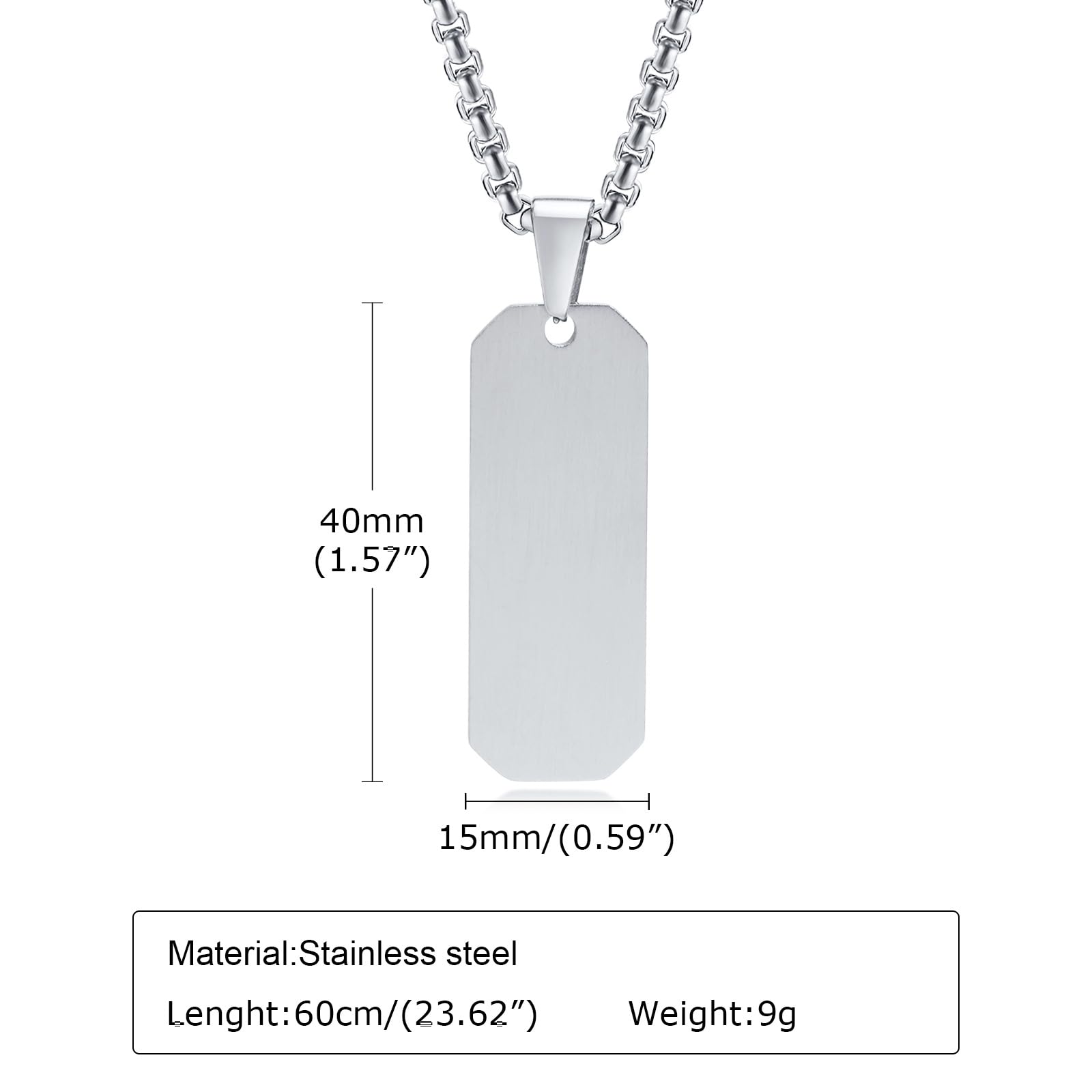 Material: created with quality 316l stainless steel,stainless steel high resistance to rust,corrosion and tarnishing.Size:Chain 24",26",28",30" optional- Pendant Width and length Size 0.59"*1.57".Style: trendy,easy to match and suitable for any Style of clothes.