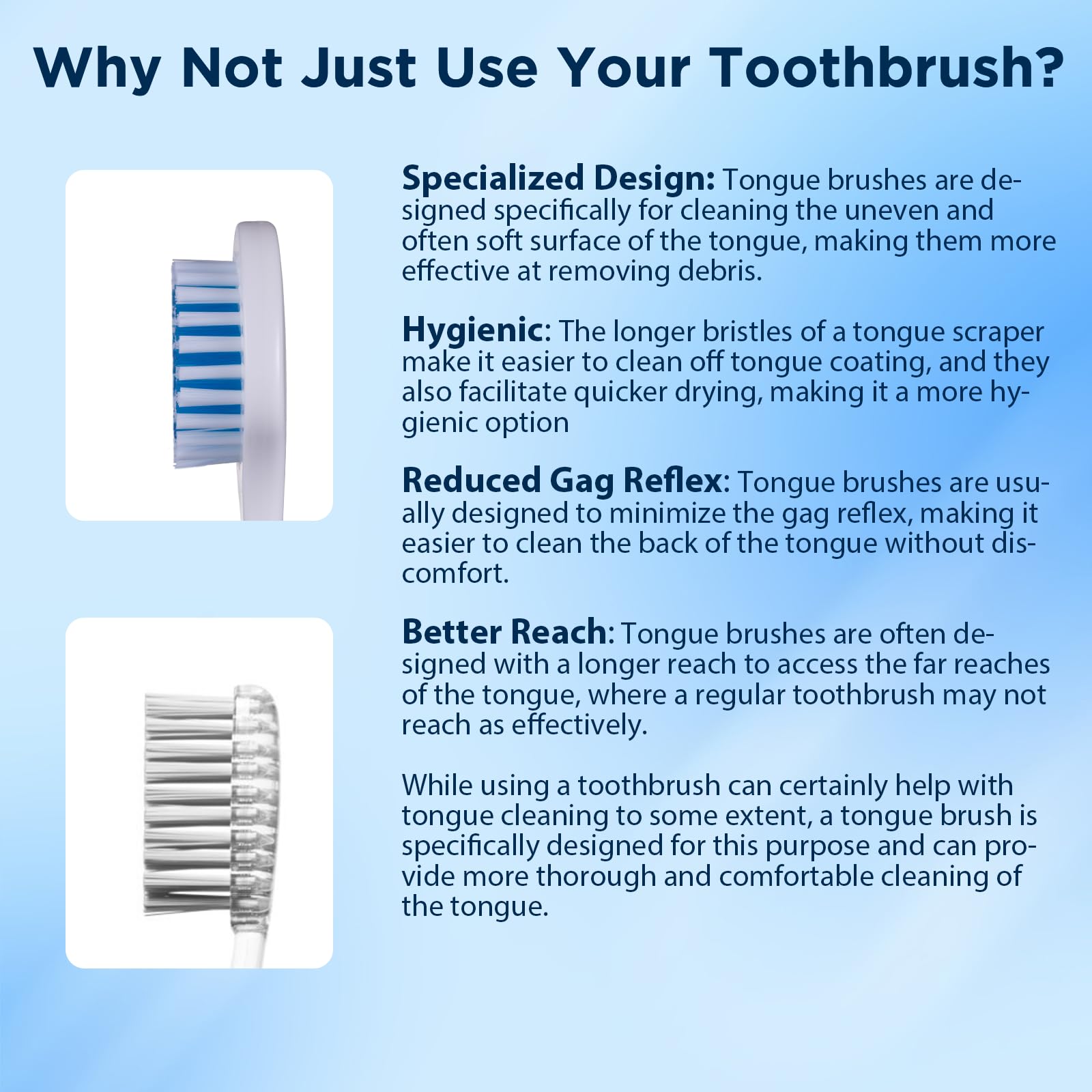 Better Reach: Tongue brushes are often designed with a longer reach to access the far reaches of the tongue, where a regular toothbrush may not reach as effectively.