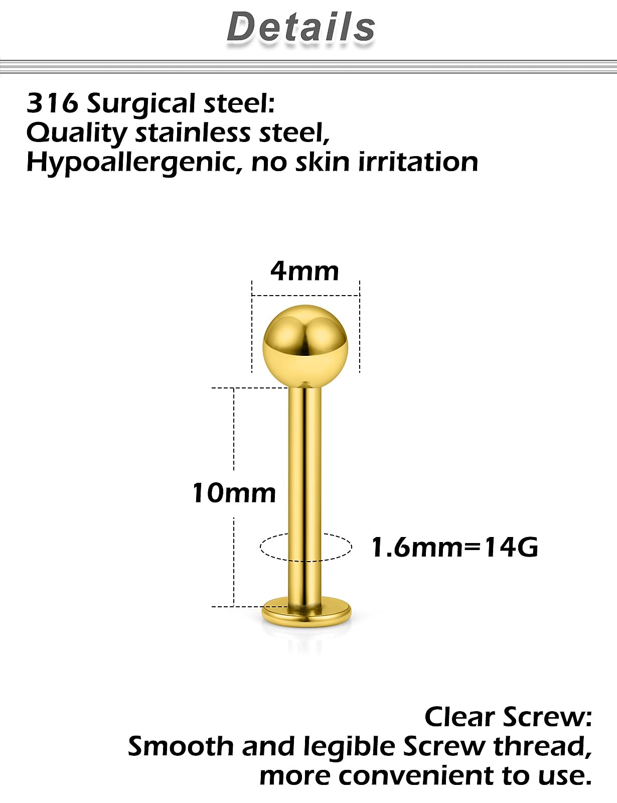 MEASUREMENTS--Lip Rings Studs Gauge Size: 14G (1.6mm); Straight Bar Length: 10mm(3/8 Inch),Top Size:4mm, The Different Sizes Made It Easy to Find the Right One for You. Color: Gold-tone.
