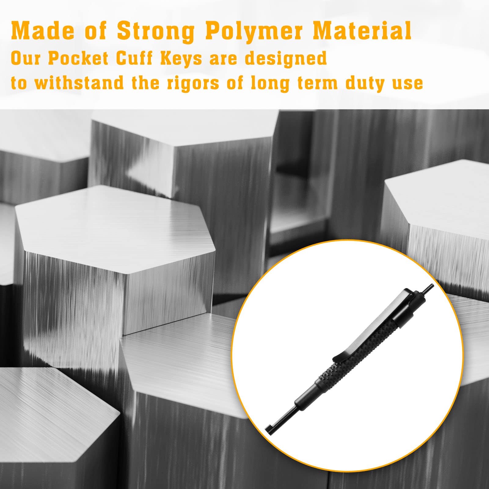 Tested for demanding use, our pocket cuff keys are designed to withstand the rigors of long term duty use. And a security unlocking pin attached, in case of an unwanted situation simply use the pin for unlocking.