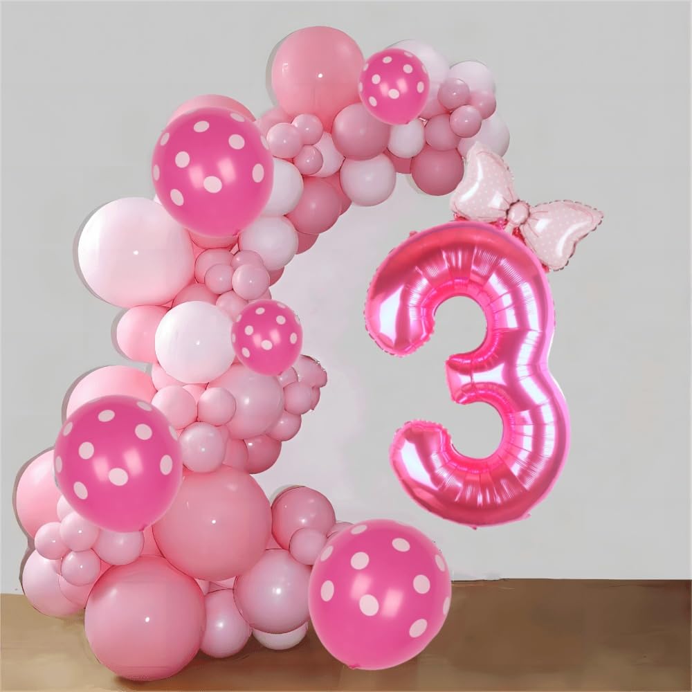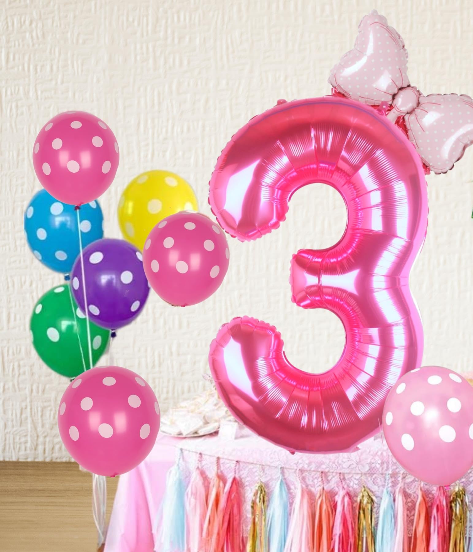 NOVEL PAIRING | CREATIVE DECORATION: The combination of vibrant pink number balloon, and polka dots bow balloon, provides diverse solutions for kids girls third birthday party decorations, we can decorate them separtely or connecte together by the glue dots, both ways selectable and charming.