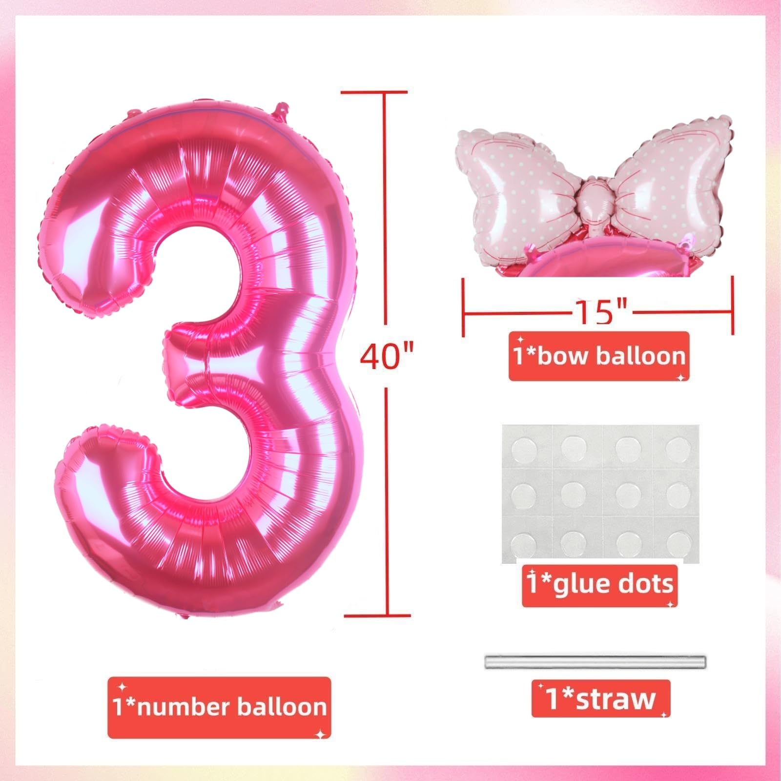 2 PCS PACK | PINK 3 BIRTHDAY BALLOONS: 1 x 40in hot pink 3 balloon number, 1 x 15in pink bow balloon, 1 x blow up straw, 1 sheet glue dots ( for connecting both balloons, or help stick balloons anywhere you want to decorate).