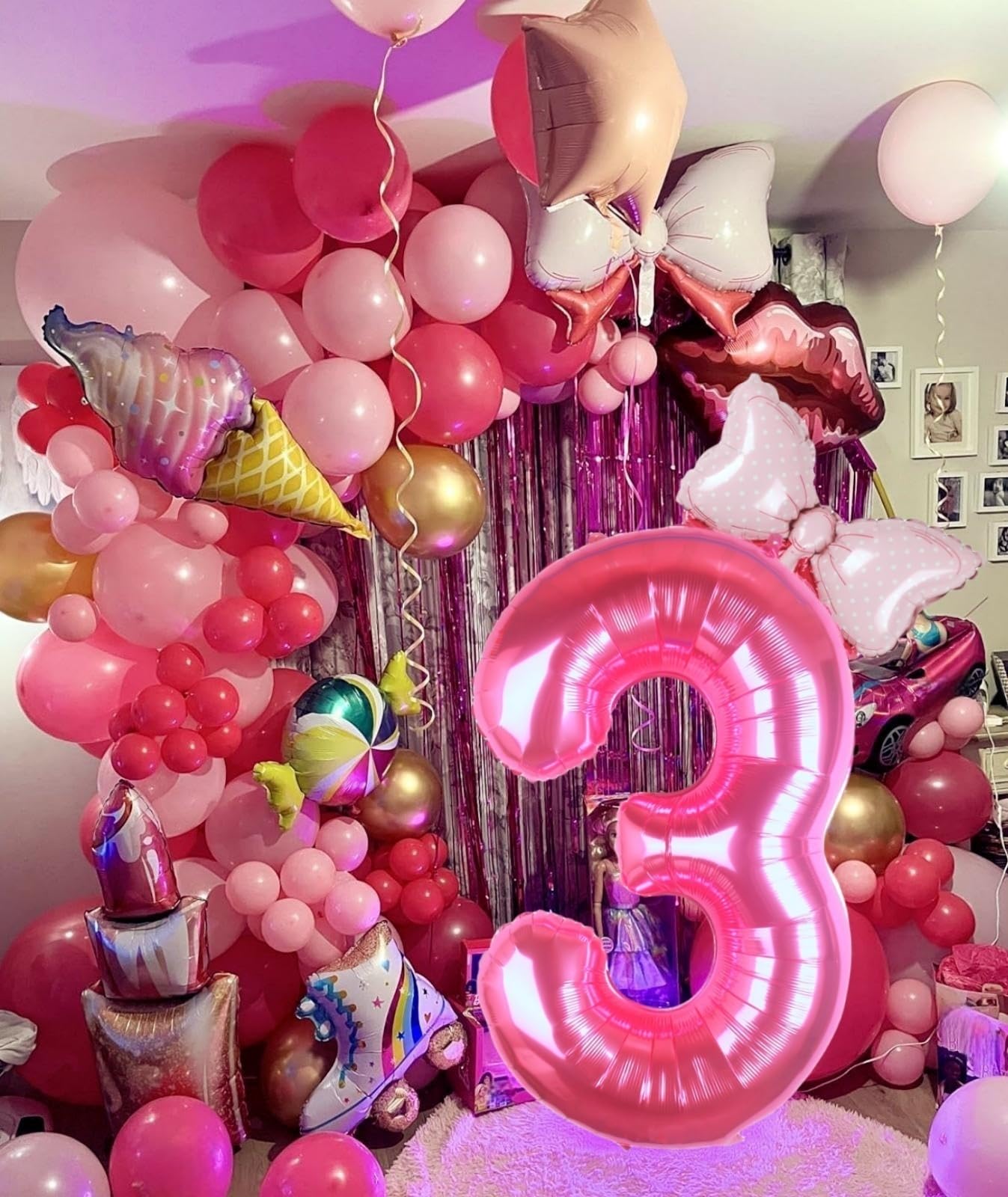 SIMPLE ASSEMBLY | DELICATE DECORATION: The girls 3rd birthday balloons, are with self sealing valve, easy to inflate, while not easy air leakage. We can hang the rose pink birthday balloon from top, or fix with glue dots on the wall, window, curtain or pink balloon garland kits, adorable pink birthday party supplies for 3 years old girls.