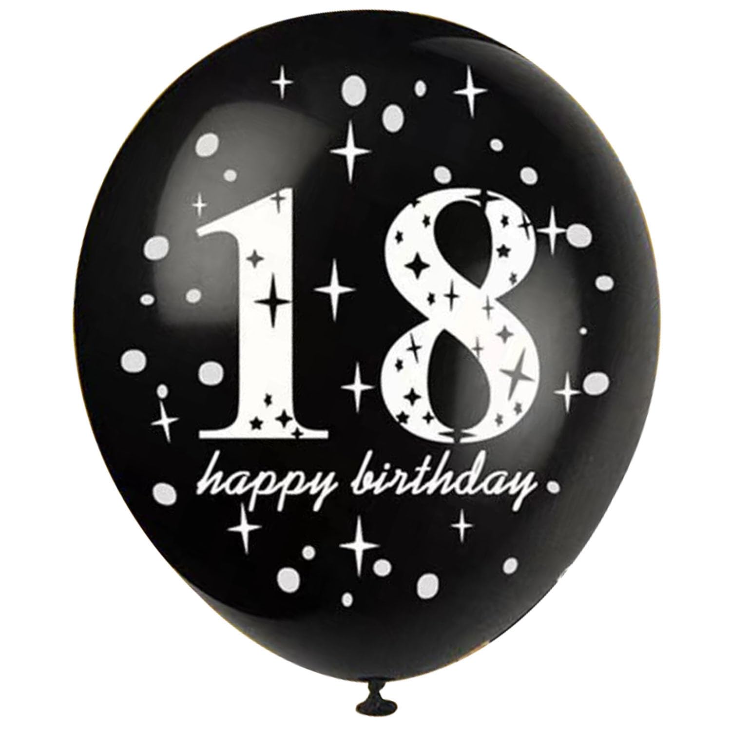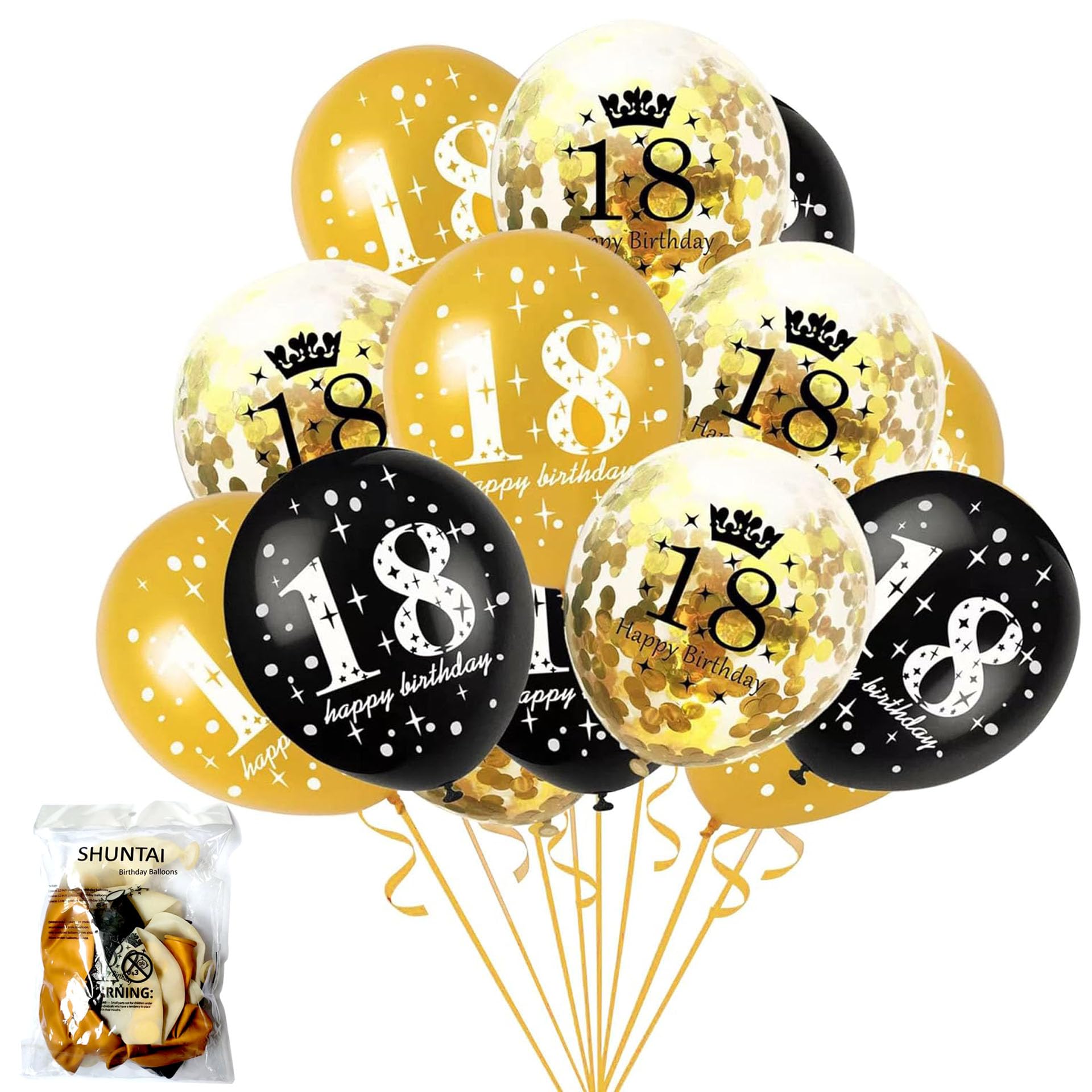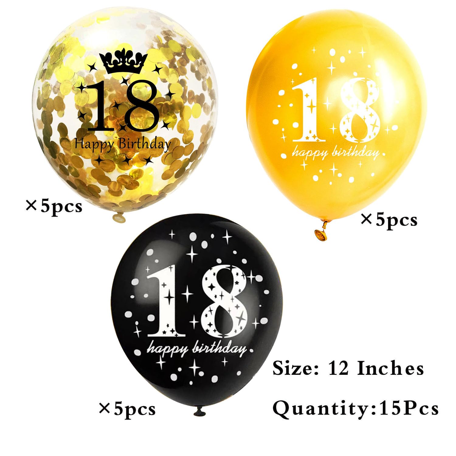 Package:5 pieces 12 inch black latex balloon printed with the words "18 Happy Birthday",5 pieces 12 inch gold latex balloon printed with the words"18 Happy Birthday",5 piece 12 inch gold confetti balloons printed with the words"18 Happy Birthday",very suitable for 18th birthday party decorations