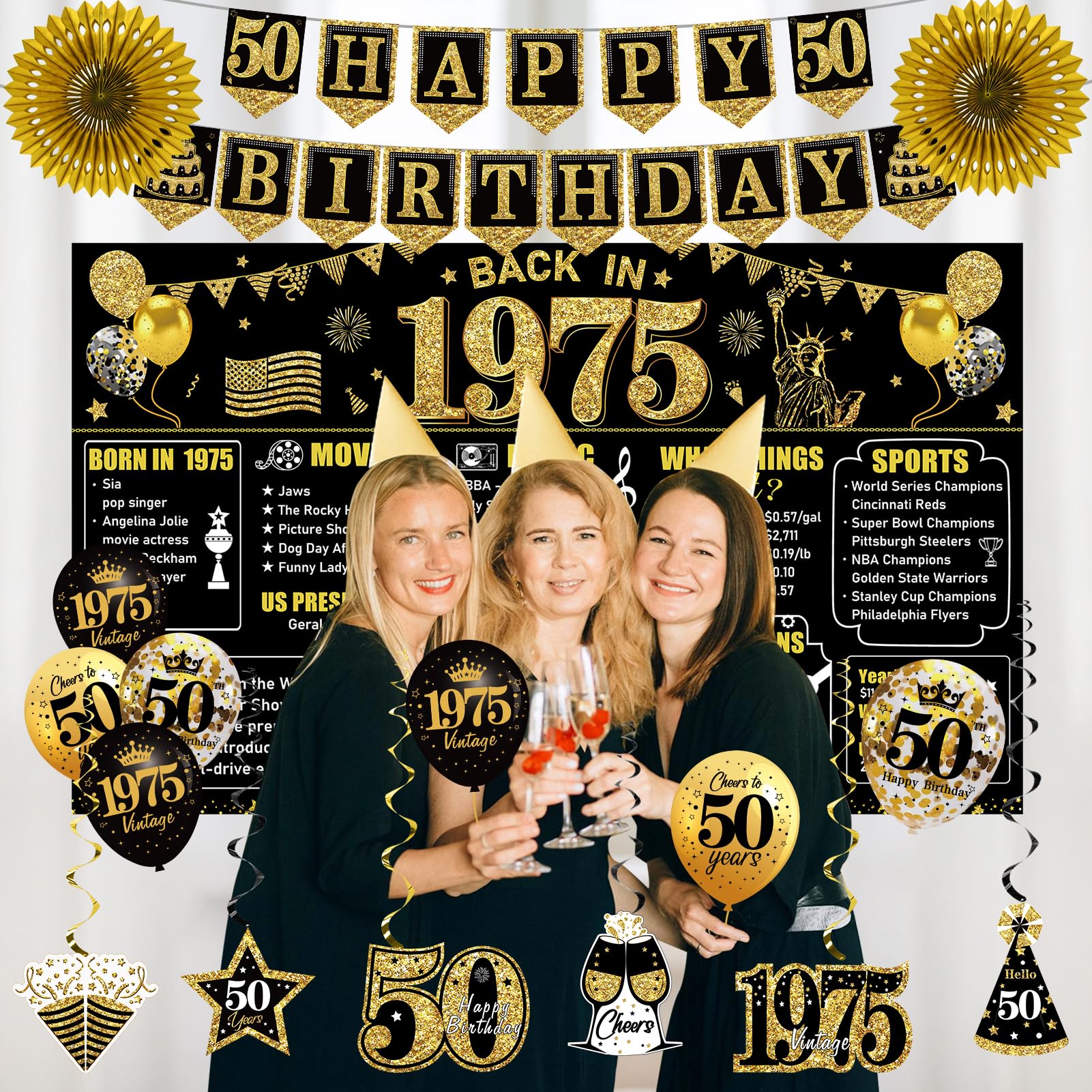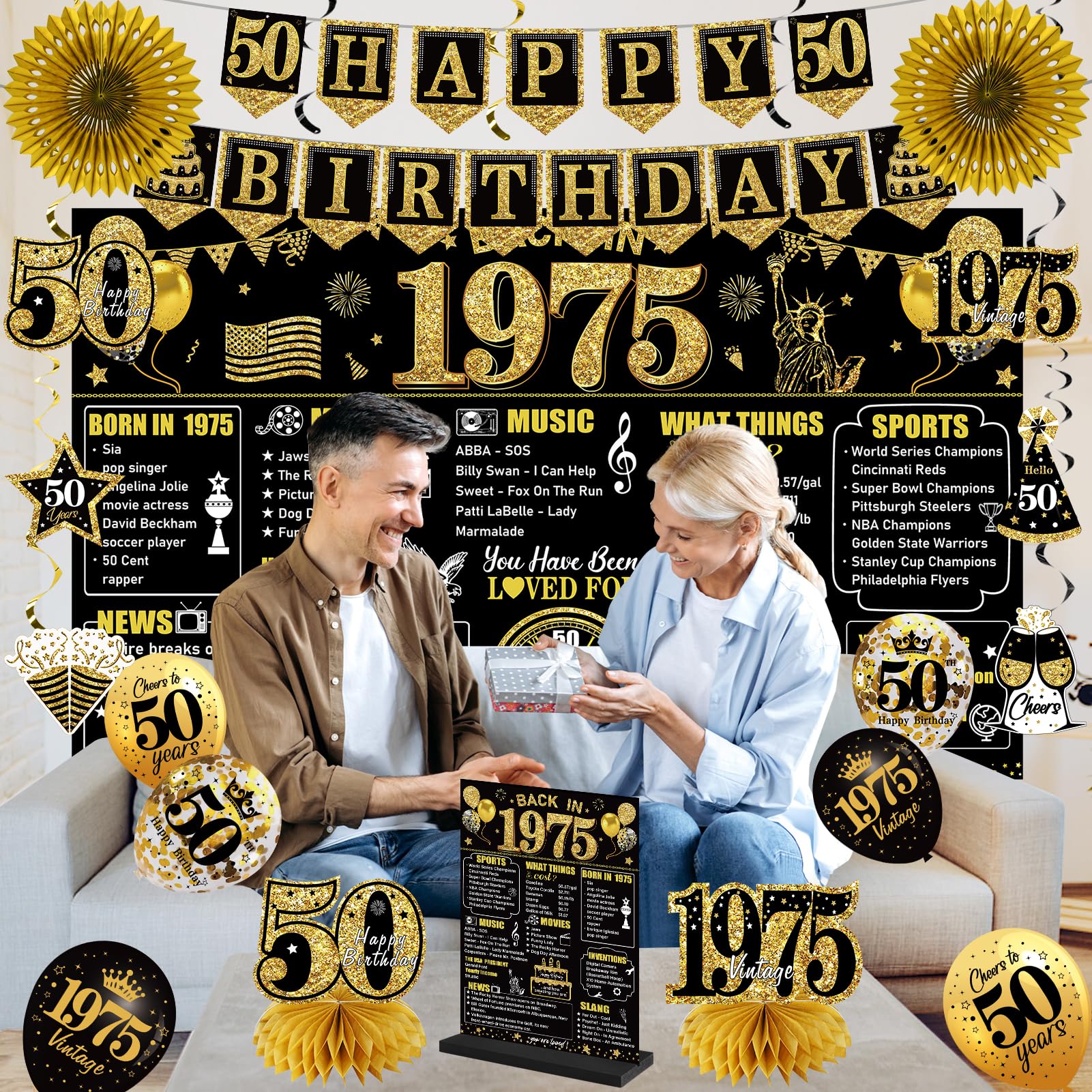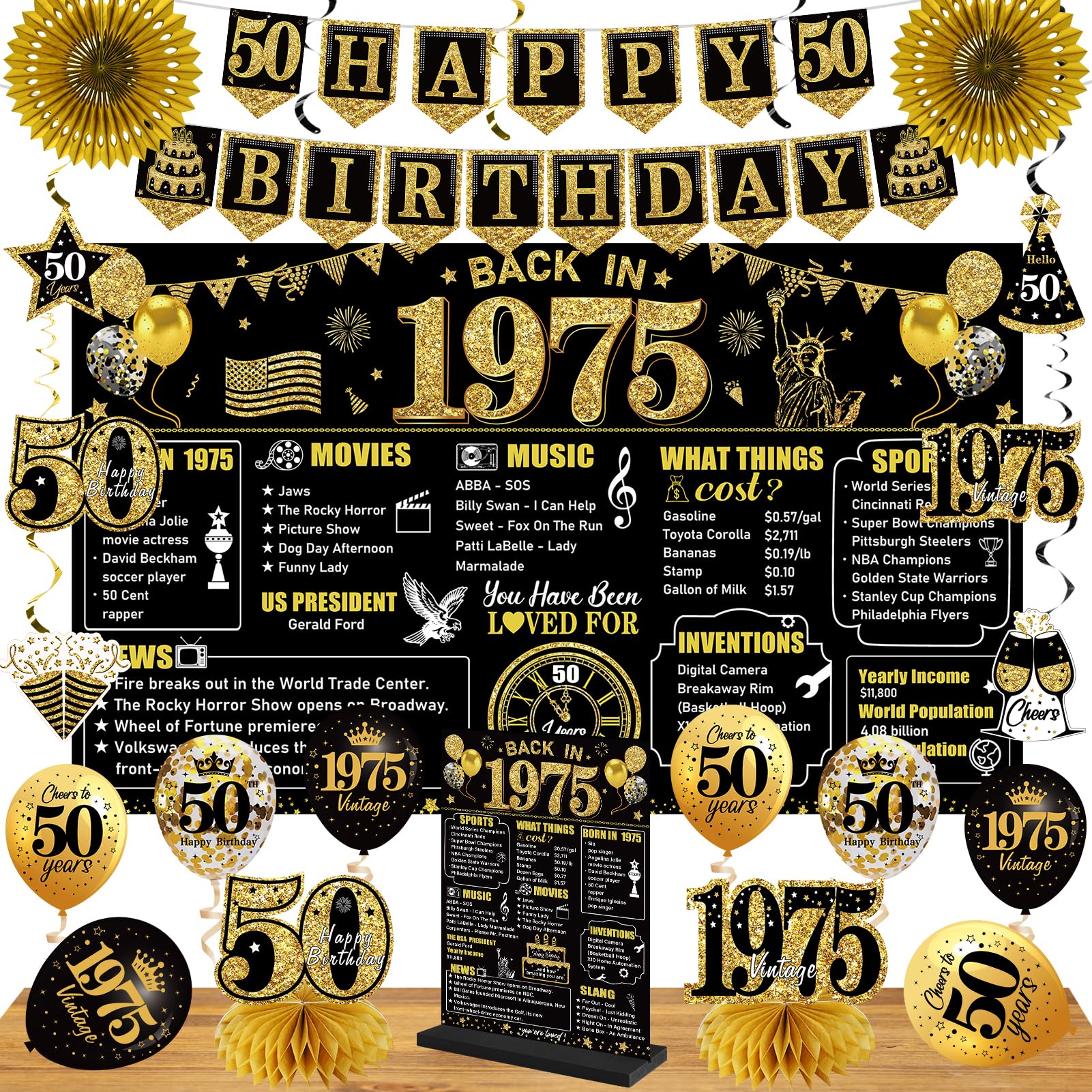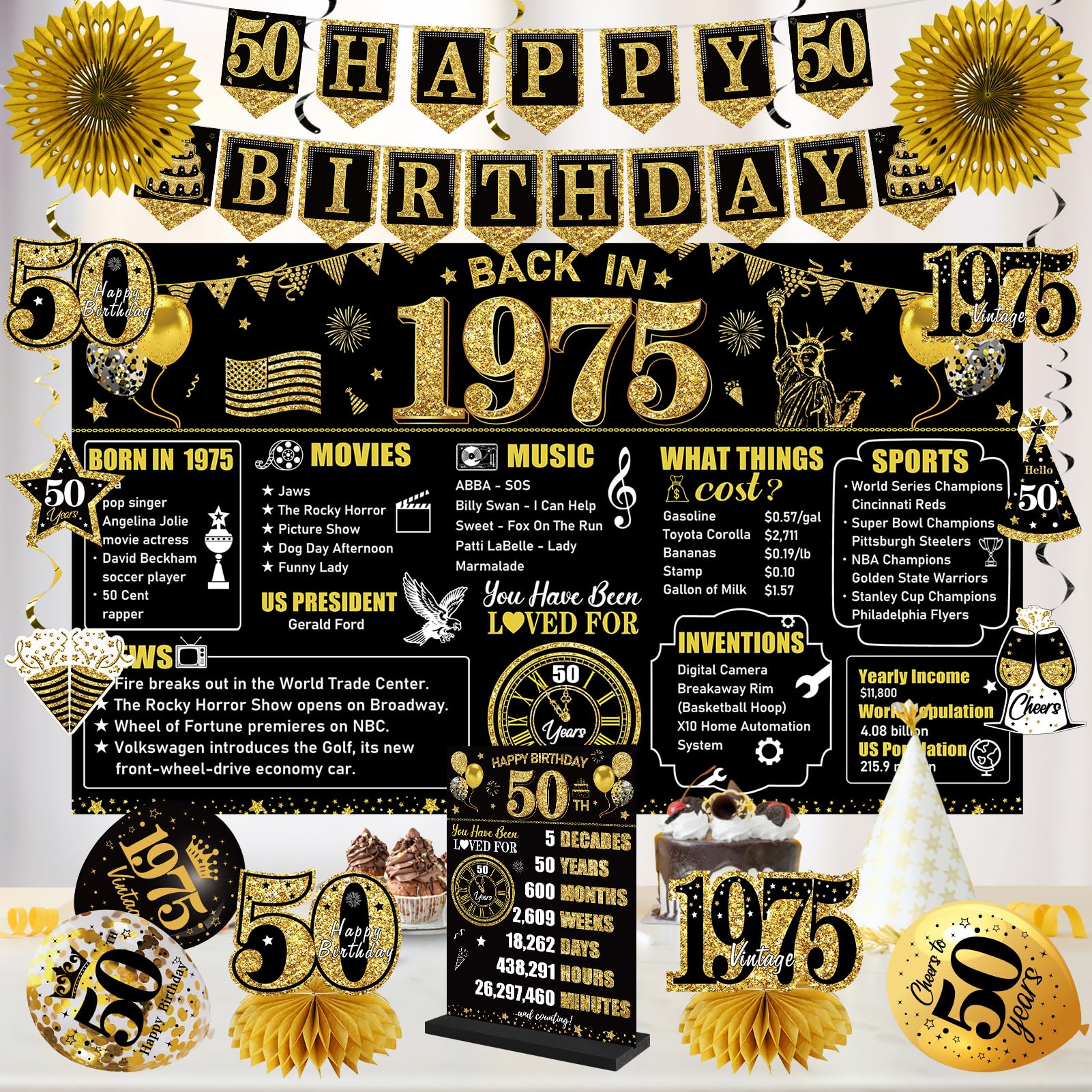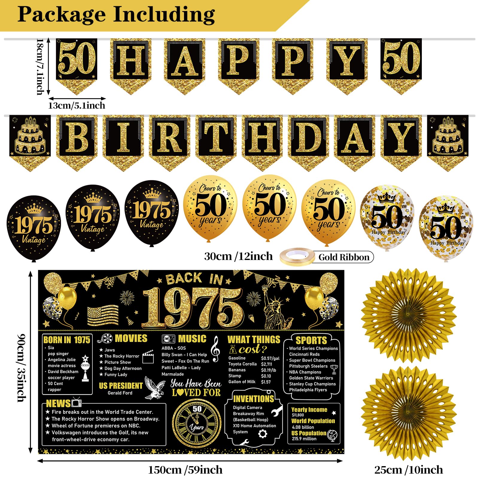 50th Birthday Decorations Kit: 1 Back in 1975 Banner Backdrop,1 Back in 1975 Table Poster Card,1 “50 Happy Birthday” banner, 6pcs Hanging Swirl, 8pcs 12inch balloons,2pcs Honeycomb Centerpiece, 2pcs 10 inch paper fan. The 50th theme birthday party decoration kit is enough to meet your decorating needs and easily create a strong birthday atmosphere in your home