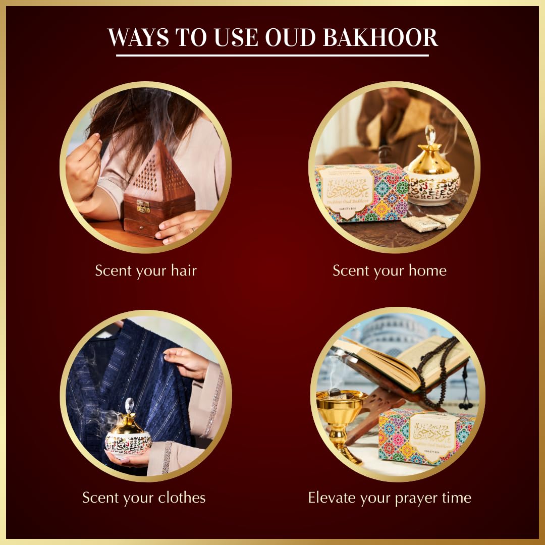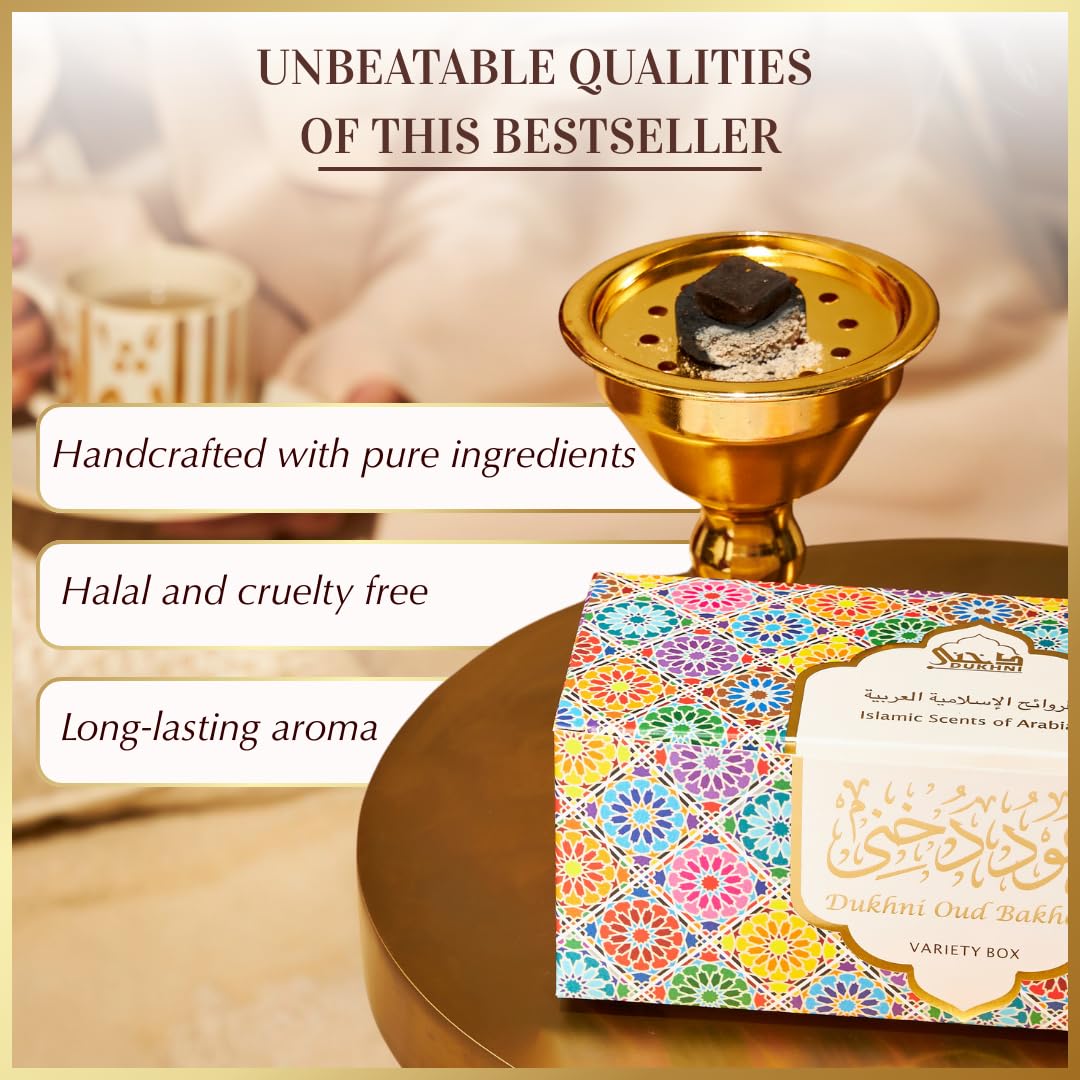 Description: Dukhni Oud Bakhoor Collection Set is carefully curated to include a wide assortment of fragrances. From sweet and floral to rich, deep and woody scents, Dukhni Bakhoor is ideal to light before prayer time, while reading Quran, meditating, relaxing or after cleaning your home. It also works well to eliminate cooking smells