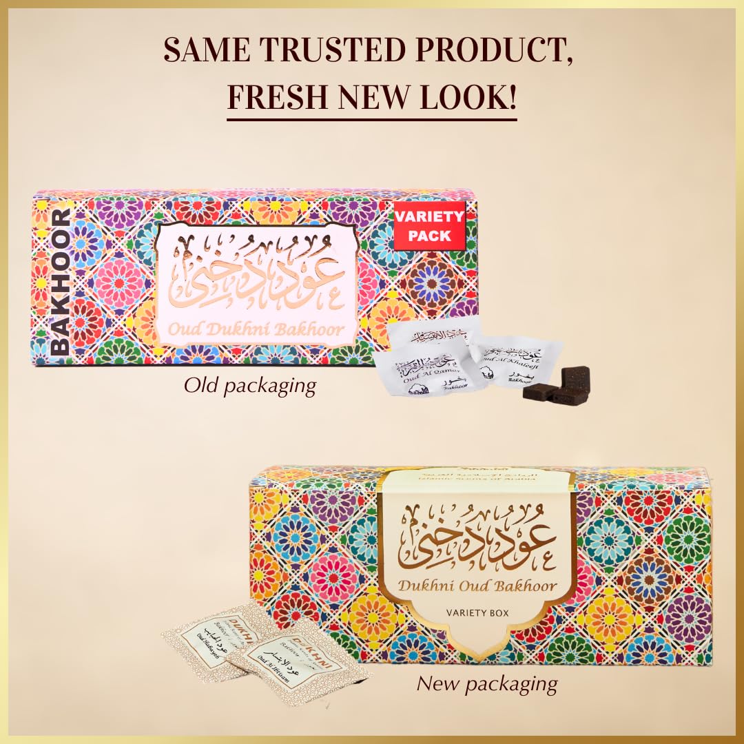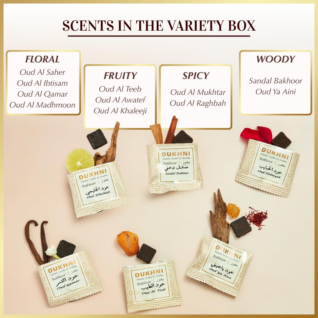 CONTENTS: 10 fragrances of Oud Bakhoor x 3 pieces each, carefully curated to include a wide assortment of fragrances for you to experience a range of Dukhni Bakhoor