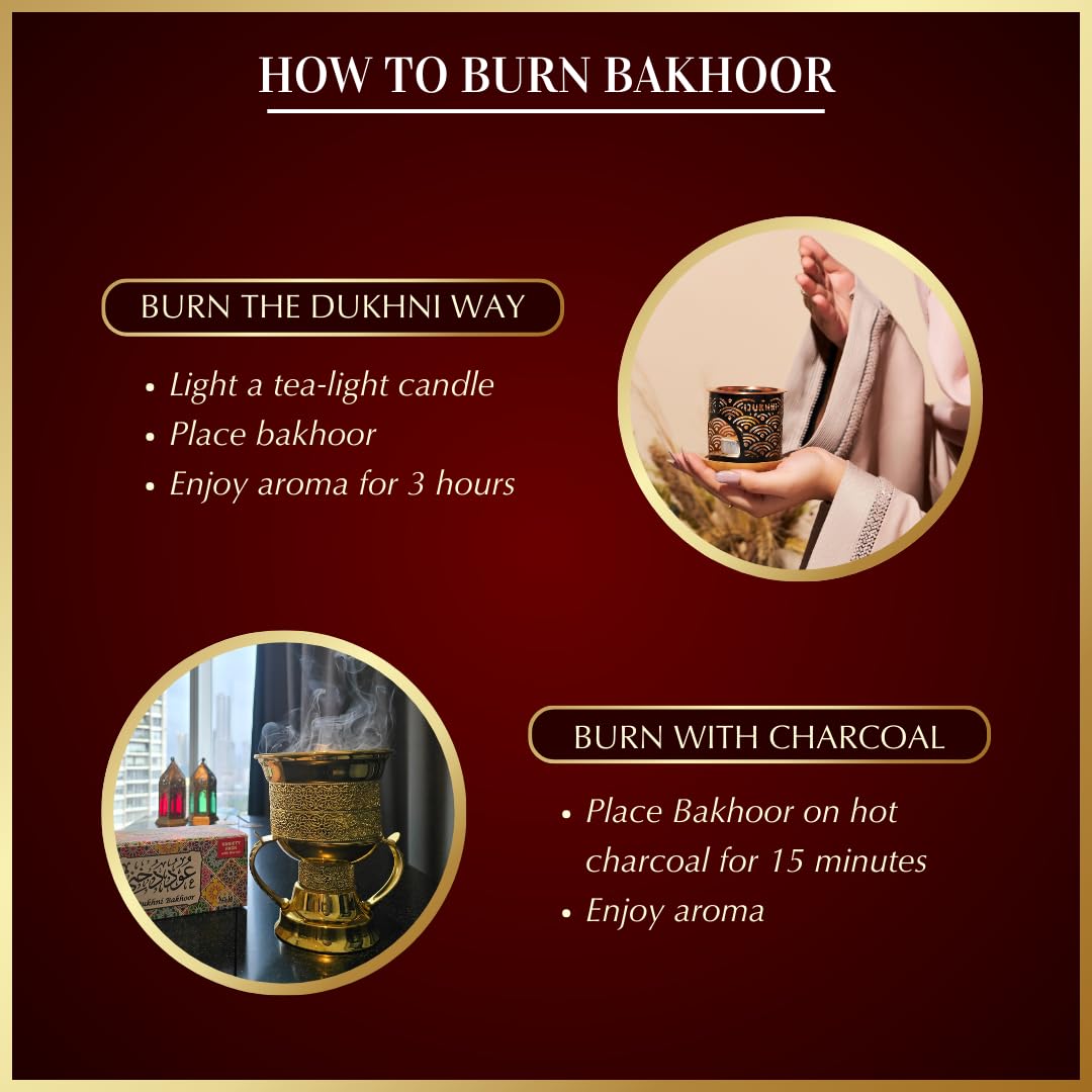 HOW TO USE: Dukhni Bakhoor can be burned the traditional way on charcoal. Place a piece of bakhoor on hot charcoal and enjoy as fragrant smoke fills up your room. Our signature burners allow for a new way of burning bakhoor with ease. Simply place a piece of bakhoor on the copper plate and light a candle below. The beauty of our burner is that it burns without smoke, steadily building up the flavour of the bakhoor and ensuring its longevity.