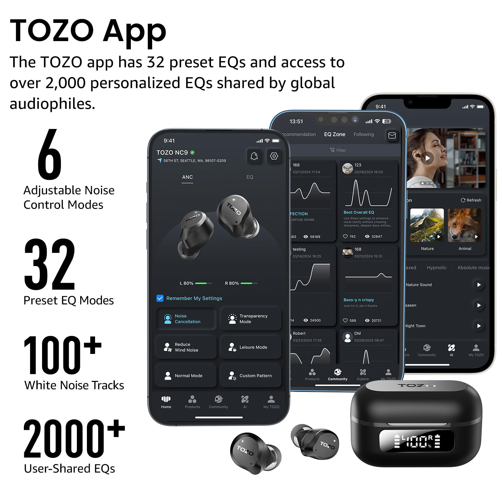 [32EQs Options & Exclusively Sharing Zone] Tailor the sound with the TOZO app further, which allows you to adjust bass levels, music style, and noise cancellation modes to your liking, and experience the joy of sharing your customized EQ with global audiophiles in EQ zone.