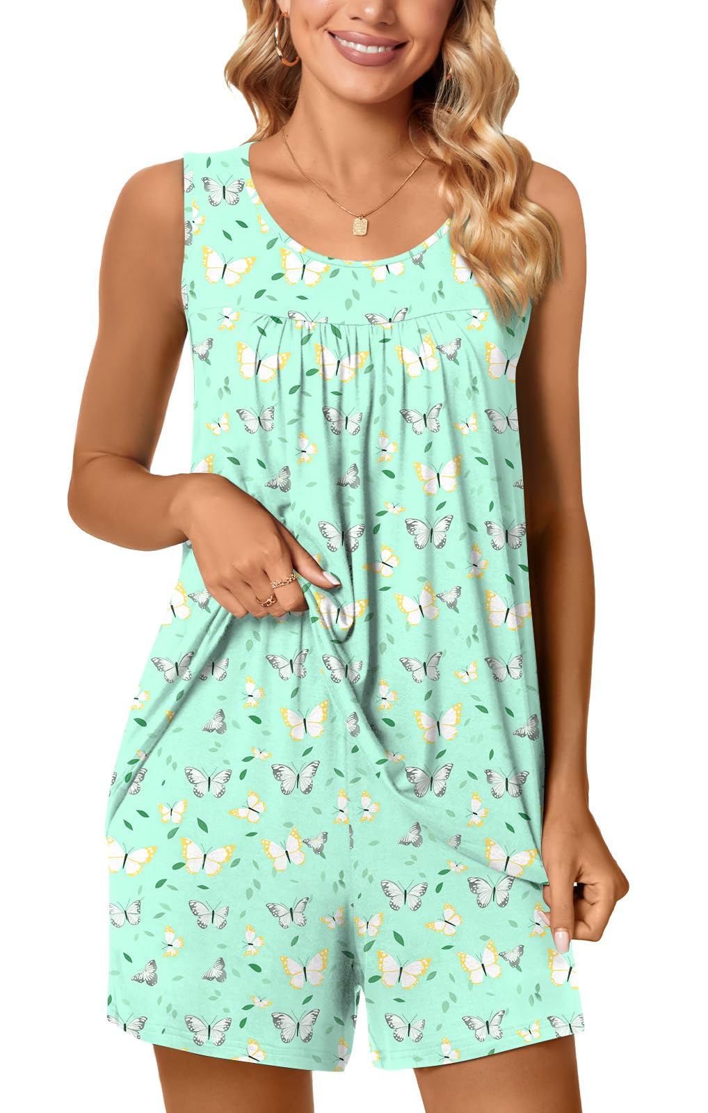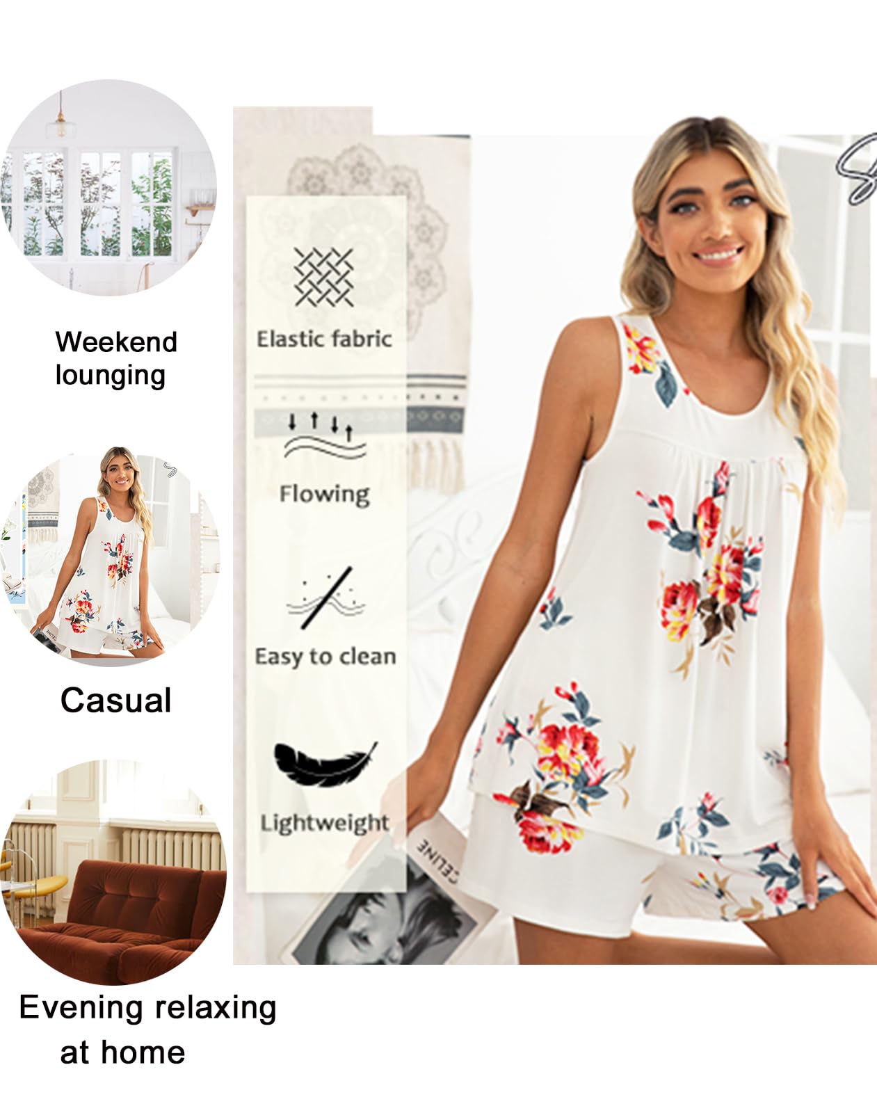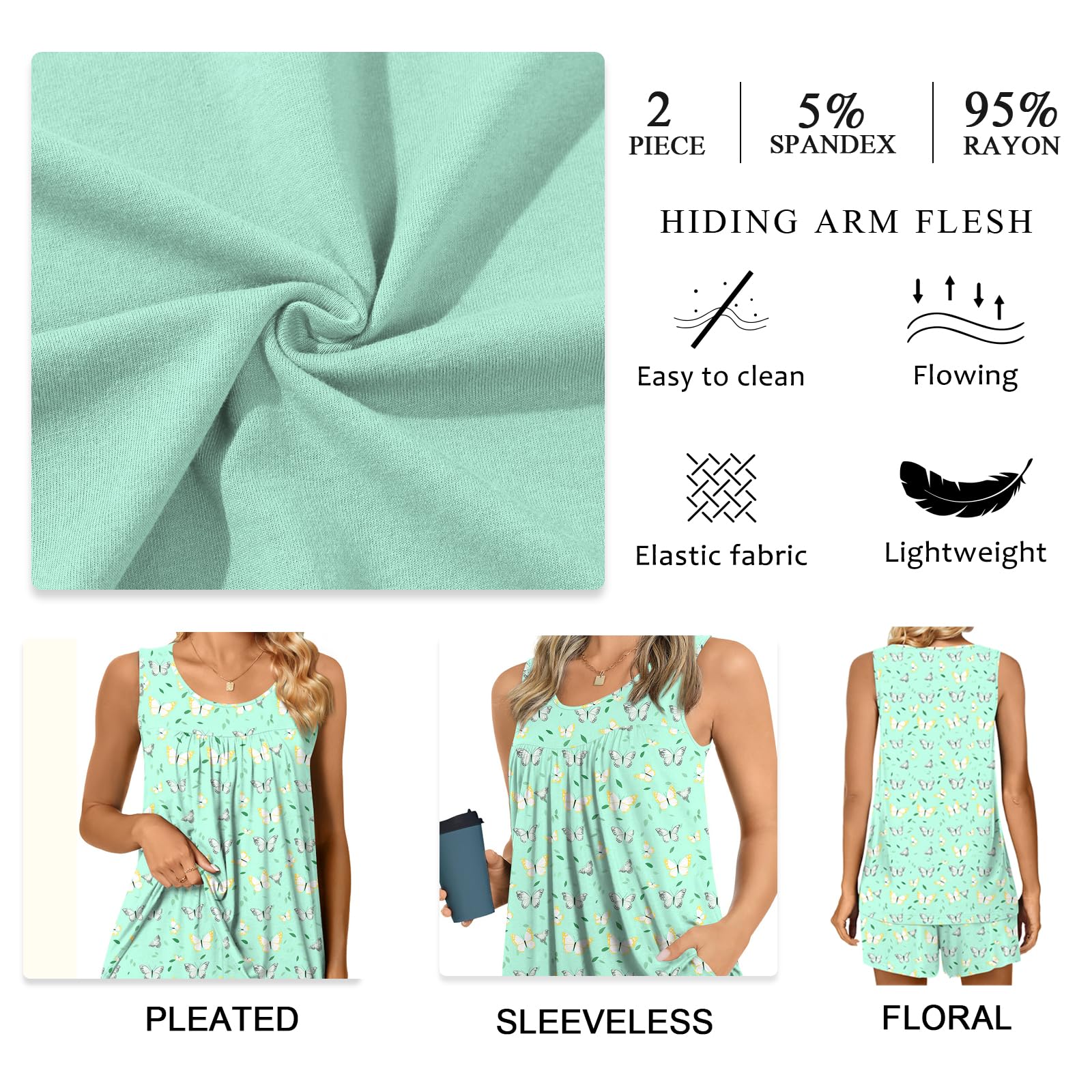 Fashion Simple Design: The ladies pajamas sets sleeveless tank tops with pleated, scoop neck design. Womens pajamas set tops perfect length covers what you need it to like your tummy. The bottoms are very roomy and fit nice with an elastic waistband adapting to different body shapes for all-night comfort. Pajamas bottoms have nice deep hidden pockets to hold cell phone or small things