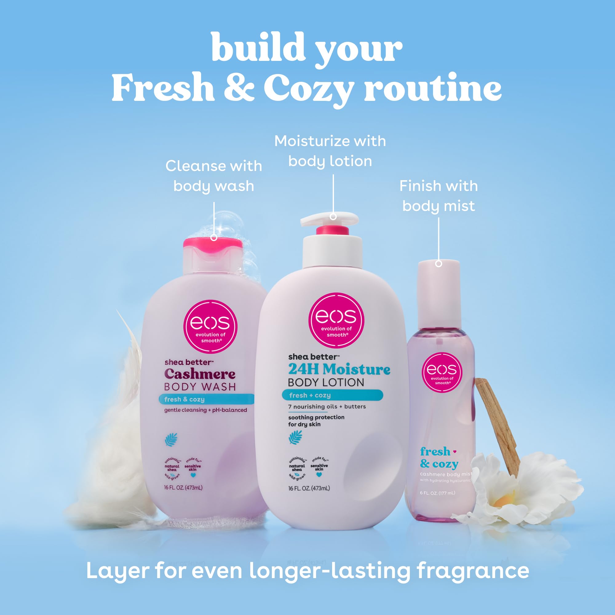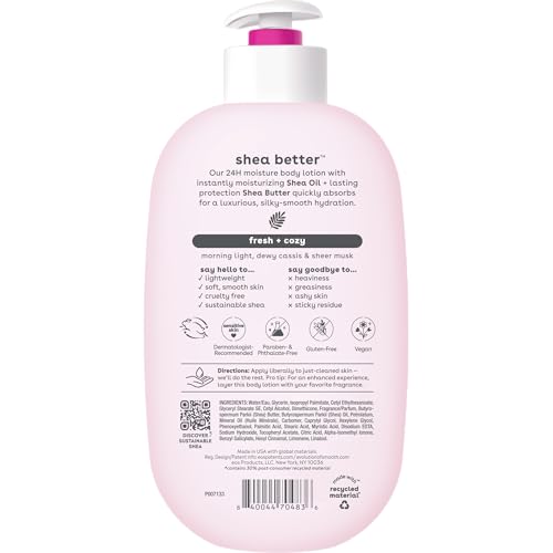 Our Fresh & Cozy shea butter lotion for women feels like what dreams are made of. Scents of morning light, dewy cassis and sheer musk create the ultimate self-care fragrance among scented lotions. eos 24 hour moisture body lotion with instantly moisturizing Shea Oil + lasting protection Shea Butter quickly absorbs for 24-hour hydration. Say hello to fast-absorption, lightweight, soft skin, and sustainable shea. Say goodbye to body skin care products with greasiness, heaviness, and sticky residue. Enjoy the soothing benefits of this moisturizing lotion, exquisitely designed for lightweight, non-greasy, fast-absorbing application.