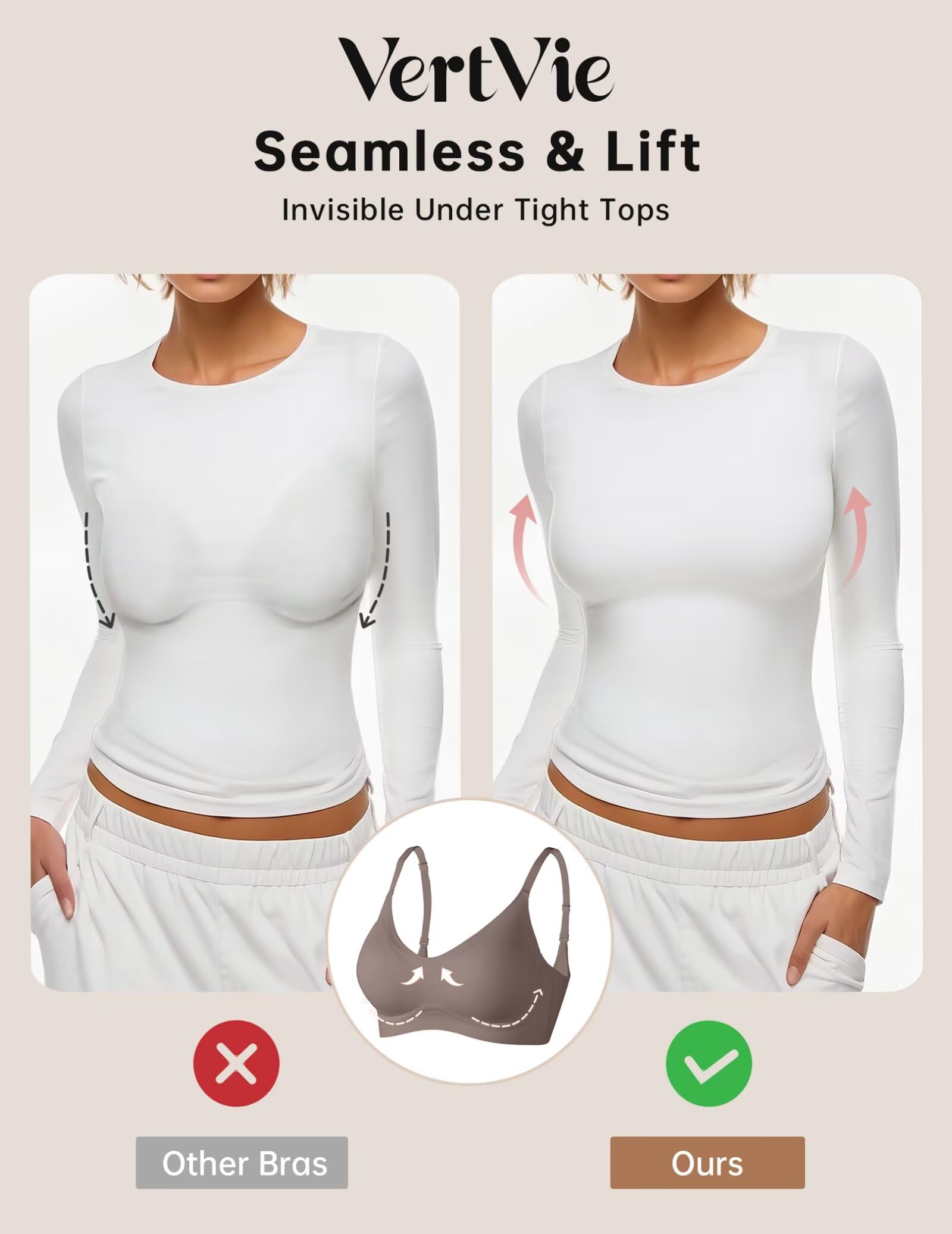 【Seamless Sports Bra】 The bras for women no underwire provide full coverage, support and lift. The sexy V-neck design enhances your bust line. The bra pads are removable, so you can take them out as needed. This everyday T-shirt bra is lightweight, invisible, and non-see-through, hugging your chest perfectly to provide a smooth look under clothing