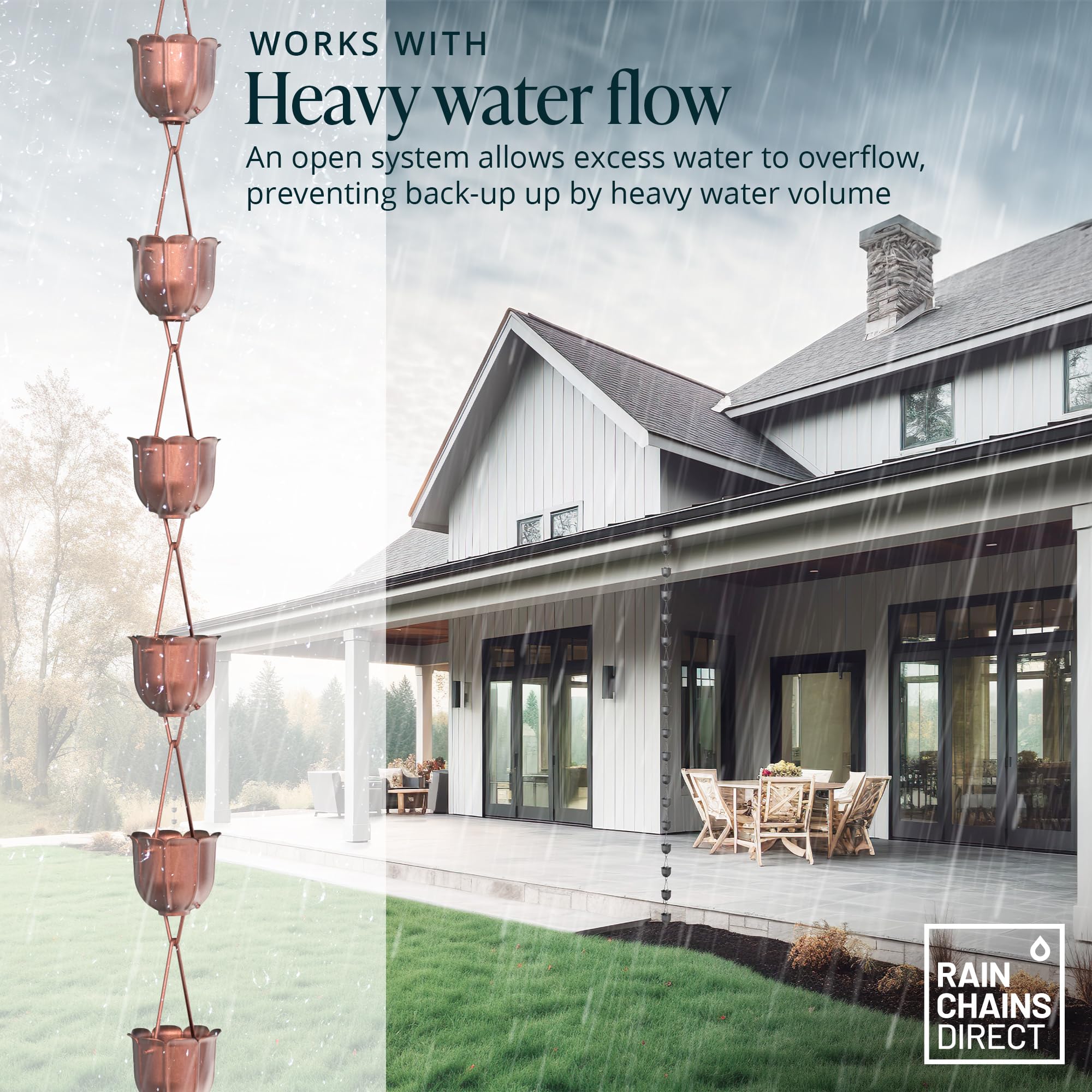 Unrestricted Water Flow - The open-flow design of the gutter chain downspout allows water to effortlessly cascade down the chain without fear of backing up, even by heavy rain.