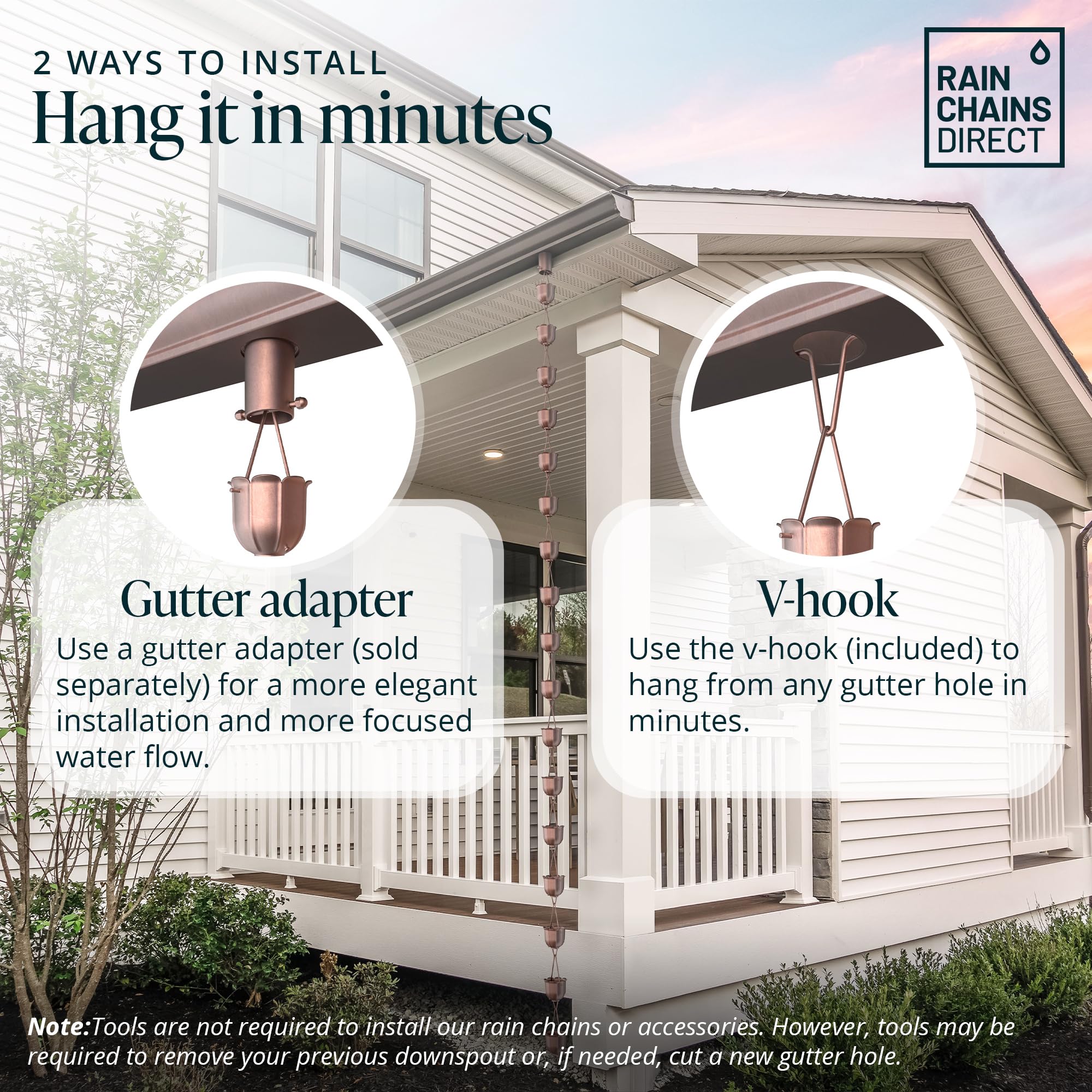 Install in a Snap - No need to be an expert. Easily swap your rain chains for downspouts using the supplied hanging hook. Our rain chains for outside are compatible with any standard gutter hole. Optional gutter installer sold separately.