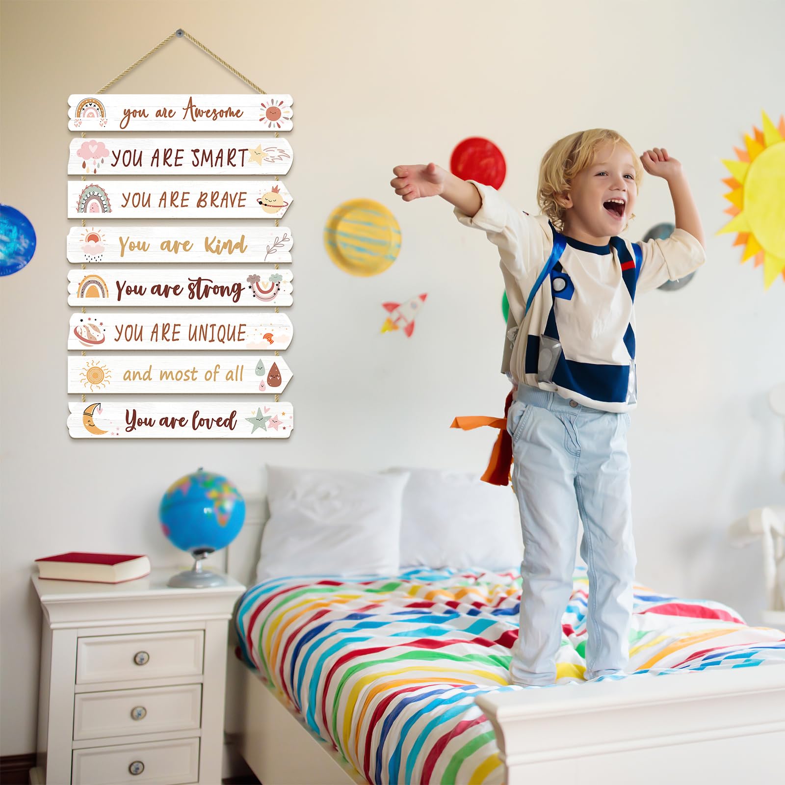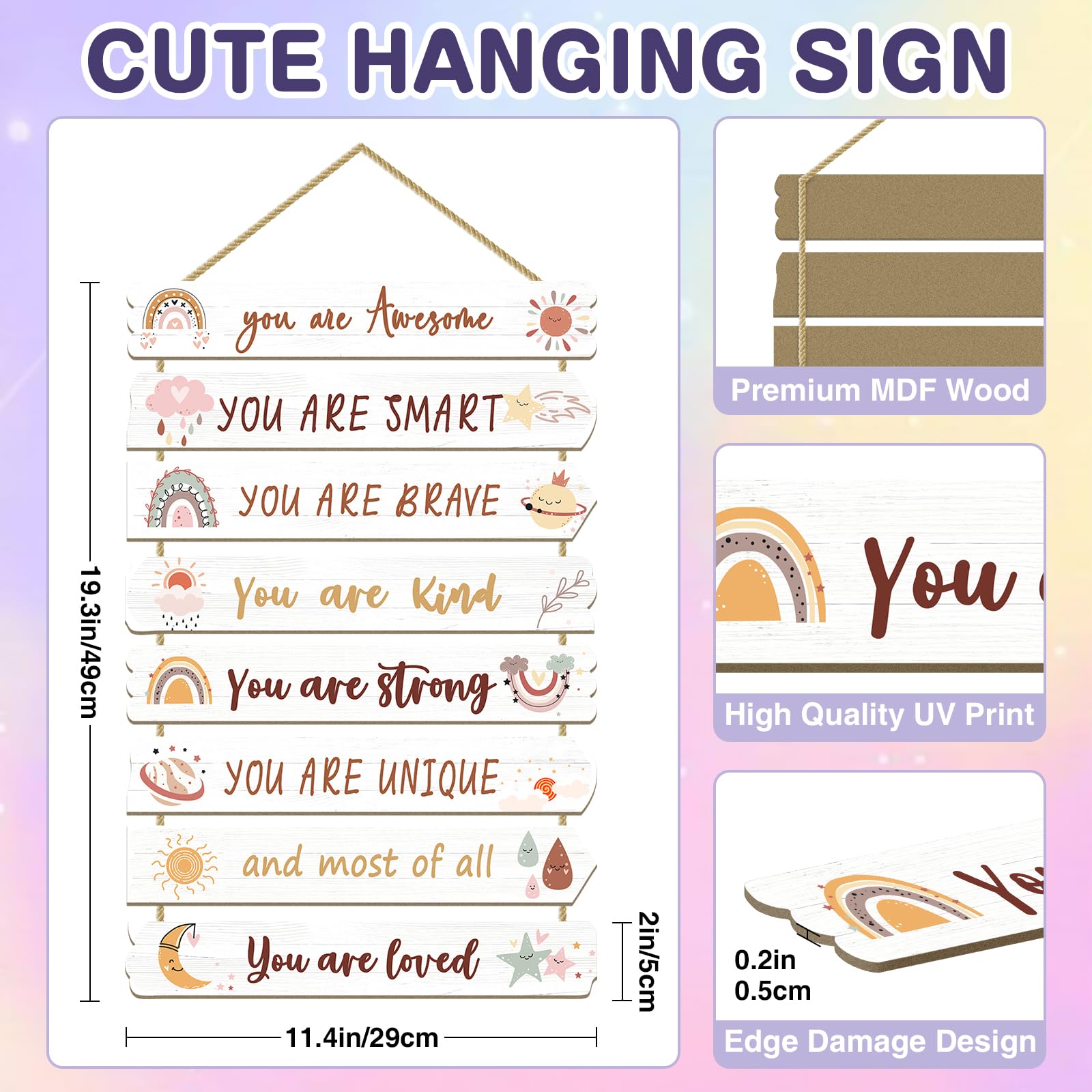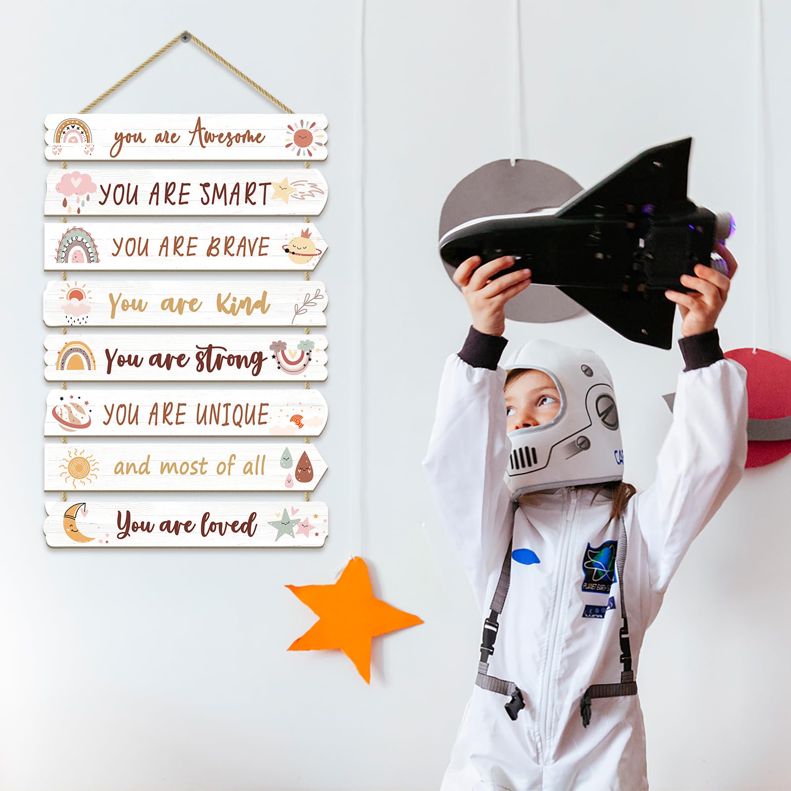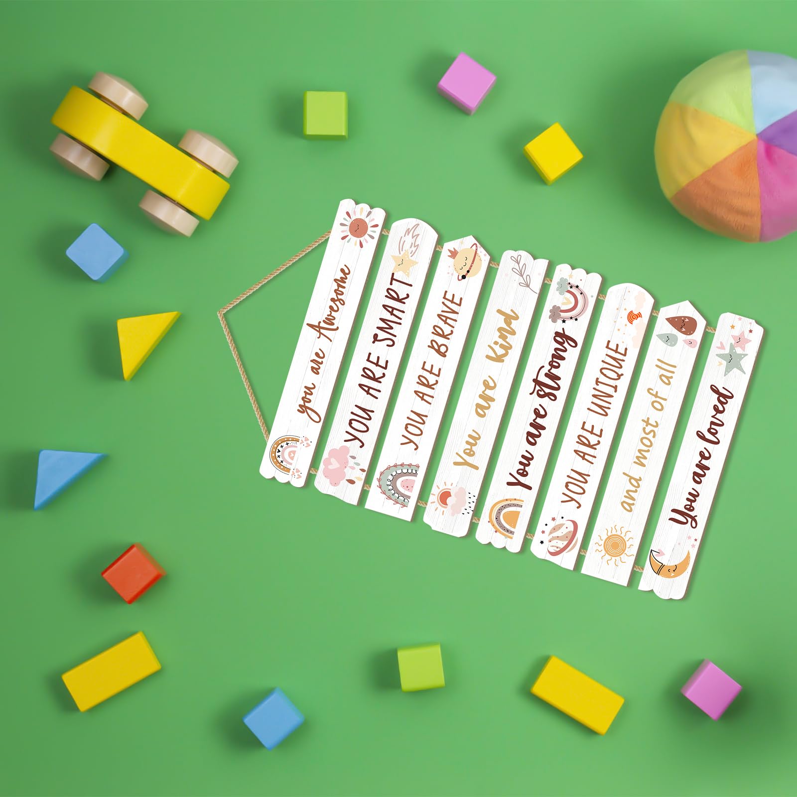 GIRL ROOM DECOR: This inspiring wall art consists of 8 pieces of MDF, measuring 11.4 inches * 2 inches and 0.2 inches thick. Professionally designed to match any style of bohemian, rustic or modern aesthetic bedroom decor. Long hemp rope, convenient for wall hanging, no installation required