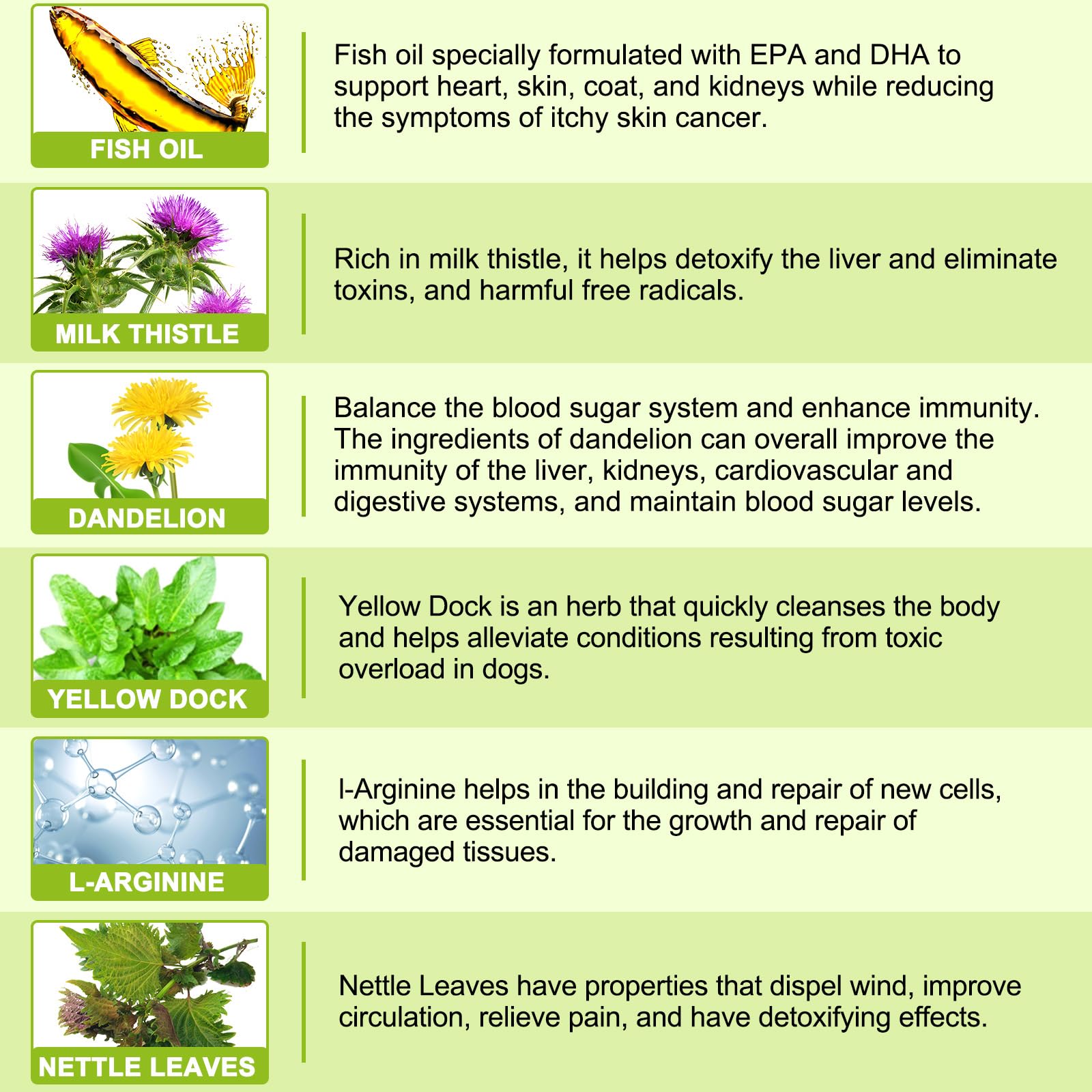 Directions for use: Administer daily amount orally based on your pet’s weight. Up to 25 lbs 1 Tablet 26-50 lbs 2 Tablets 51-74 lbs 3 Tablets Over 75 lbs 4 Tablets PRODUCT FACTS Active ingredients per 1 Chewable Tablets (0.8g) MillkThistle Extract 100 mg Yellow Dock 50 mg Dandelion Extract 50 mg L-Arginine 50 mg EPA (from Fish Oil Powder) 45 mg DHA (from Fish Oil Powder) 30 mg Nettle Leaf Extract 25 mg Potassium 25 mg Inositol 25 mg Choline bitartrate 25 mg Cordyceps Mushroom 5 mg SoyLecithin 5 mg Vitamin B6 6 mg Riboflavin 5.1 mg Vitamin B1(as Thiamine) 4.5 mg Folate 200mcg Vitamin B12 12 mcg Inactive Ingredients: Desiccated Liver, Dicalcium Phosphate, Microcrystalline Cellulose, Natural/Peking Duck Flavor, Silicon Dioxide, Stearic Acid. WARNING: Use only as directed. This product is intended for dogs only and should not be consumed by humans. Contact a health professional immediately in case of accidental overdose or any irritation. Safe use in pregnant dogs or animals intended for breeding has not been proven. Give this medication to the animal after it has eaten or with food to prevent gastrointestinal discomfort. STORAGE: Store in a cool, dry place away from direct sunlight. For maximum freshness, keep the lid tightly sealed. Keep out of the reach of children and animals.