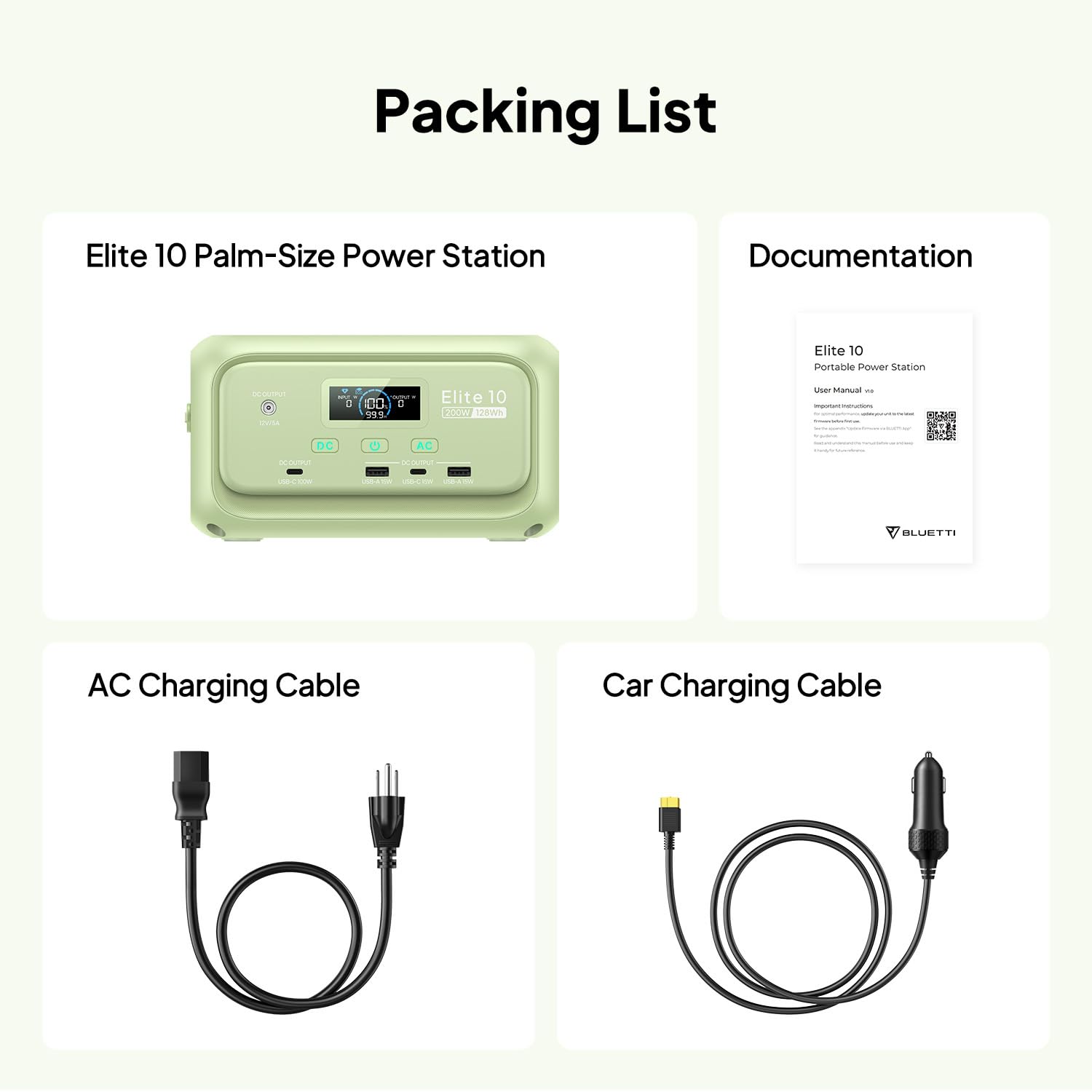 [What You Get] - BLUETTI Elite 10 mini power station (7.87 × 5.75 × 4.33 in, only 3.97 lbs), AC charging cable, car charging cable, user manual.